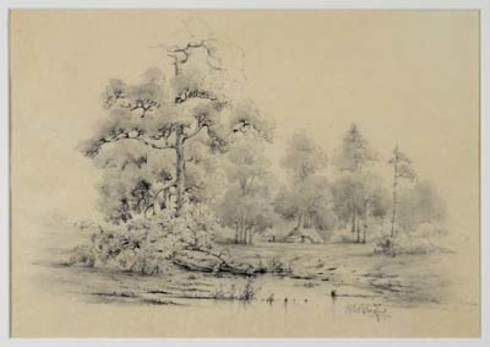 Bosvijver met hut op de achtergrond