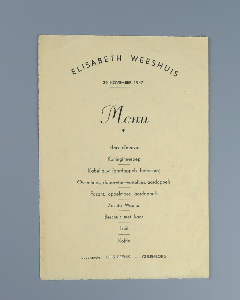 menukaart geassocieerd met het Elisabeth Weeshuis en...