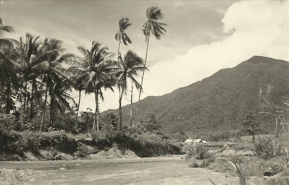 Nieuw-Guinea; palmbomen met berg op de achtergrond