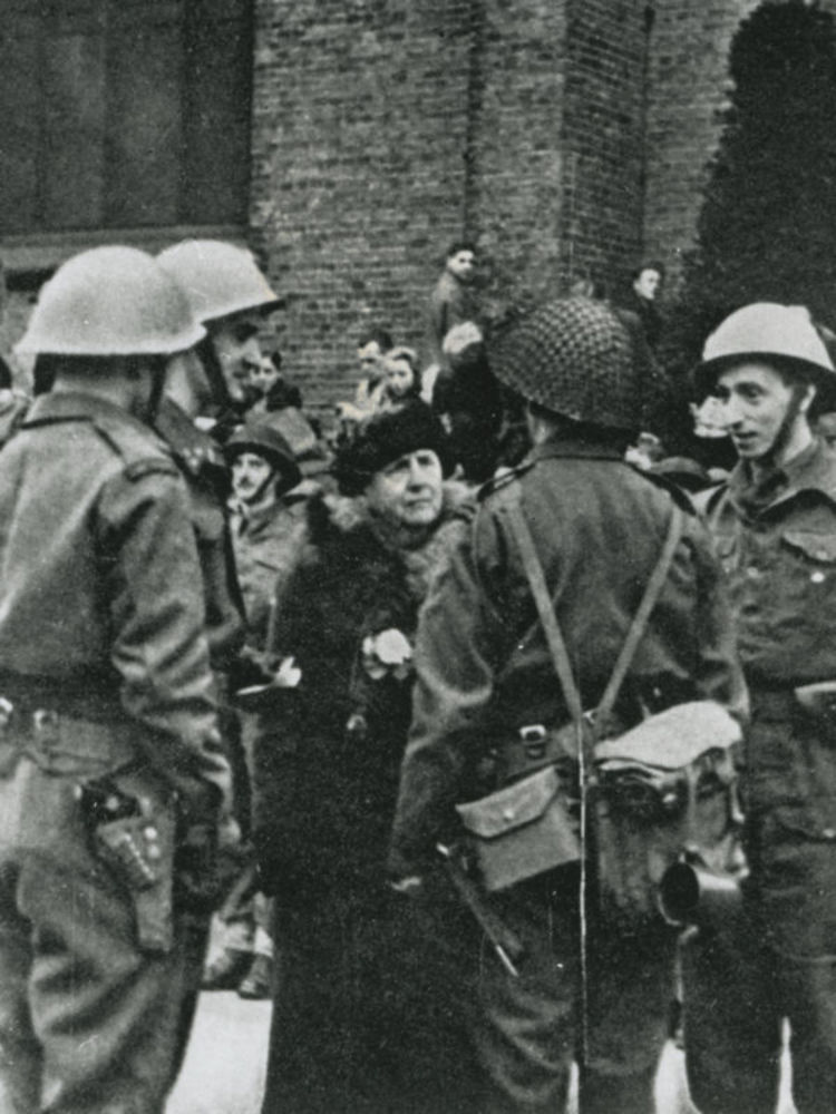 Foto van koningin Wilhelmina in gesprek met leden va...