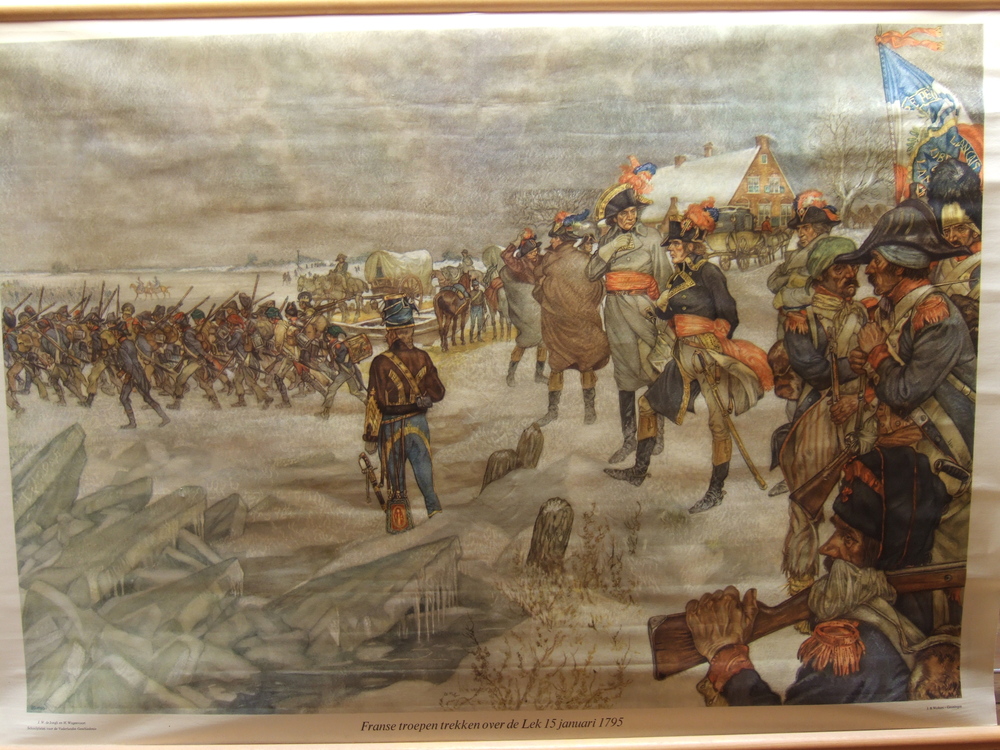Schoolplaat op linnen "Franse troepen trekken over d...