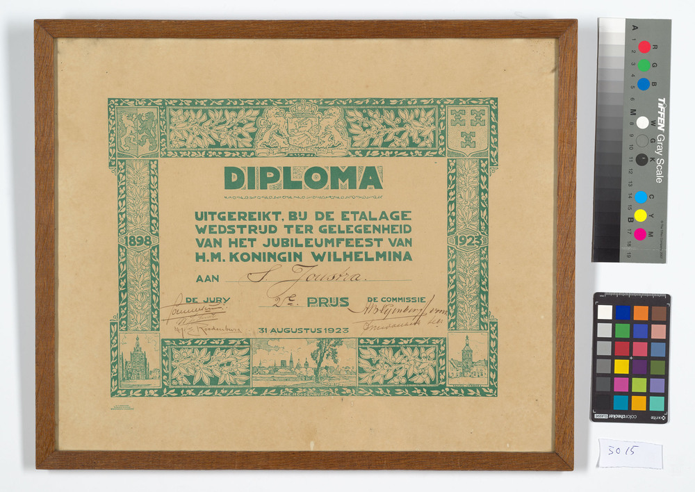 diploma van bedrukt papier, uitgereikt aan S. Joustr...