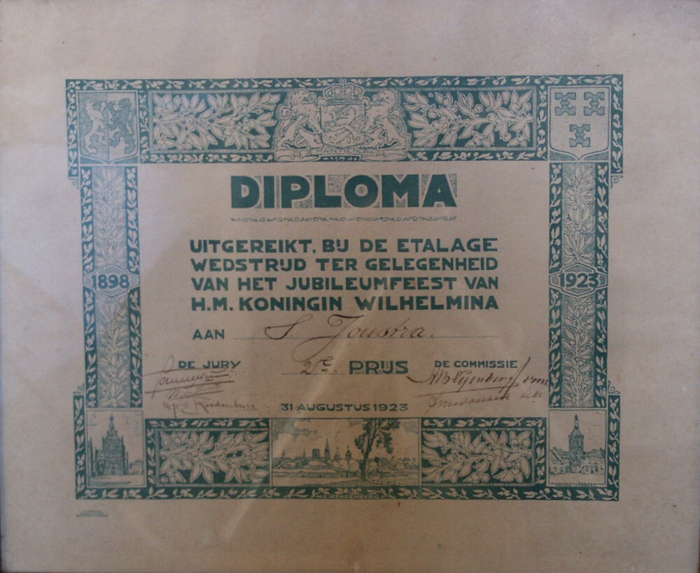 diploma van bedrukt papier, uitgereikt aan S. Joustr...