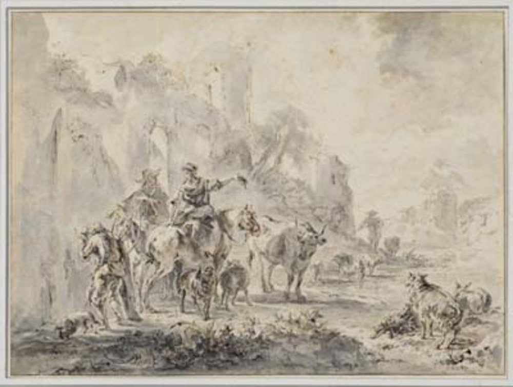 Herders en vee bij ruïnes