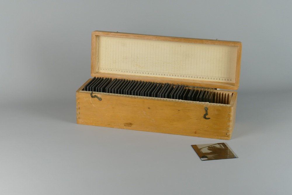 kistje van hout, inhoudende 46 glasdia's, geassociee...