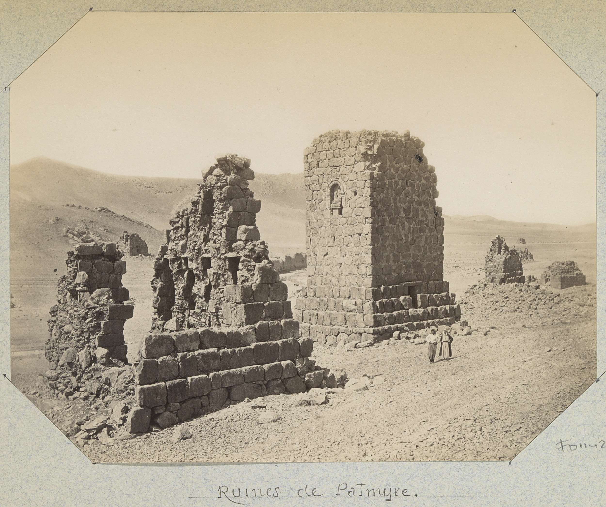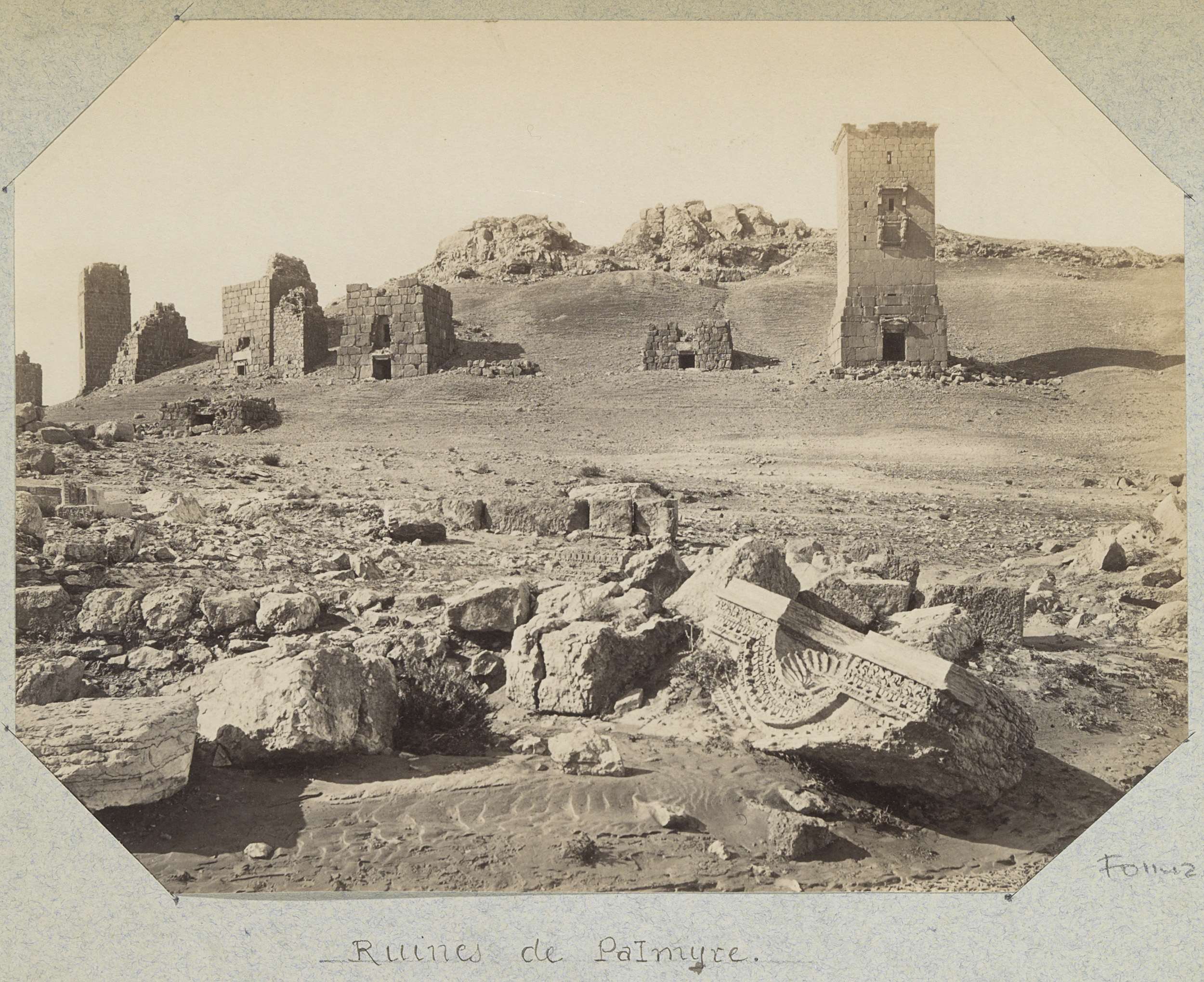Gezicht op vervallen gebouwen en een toren van Mont ...