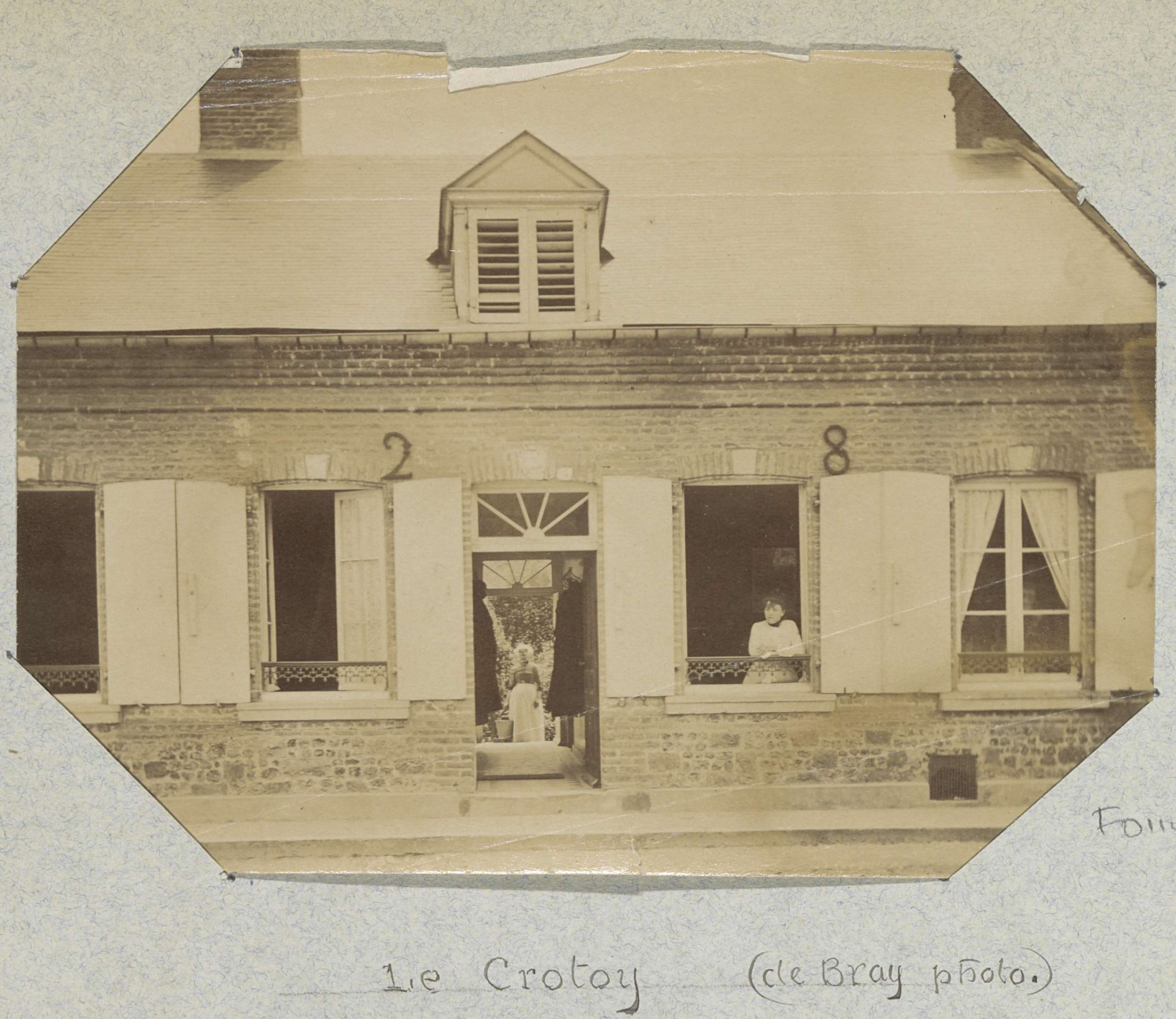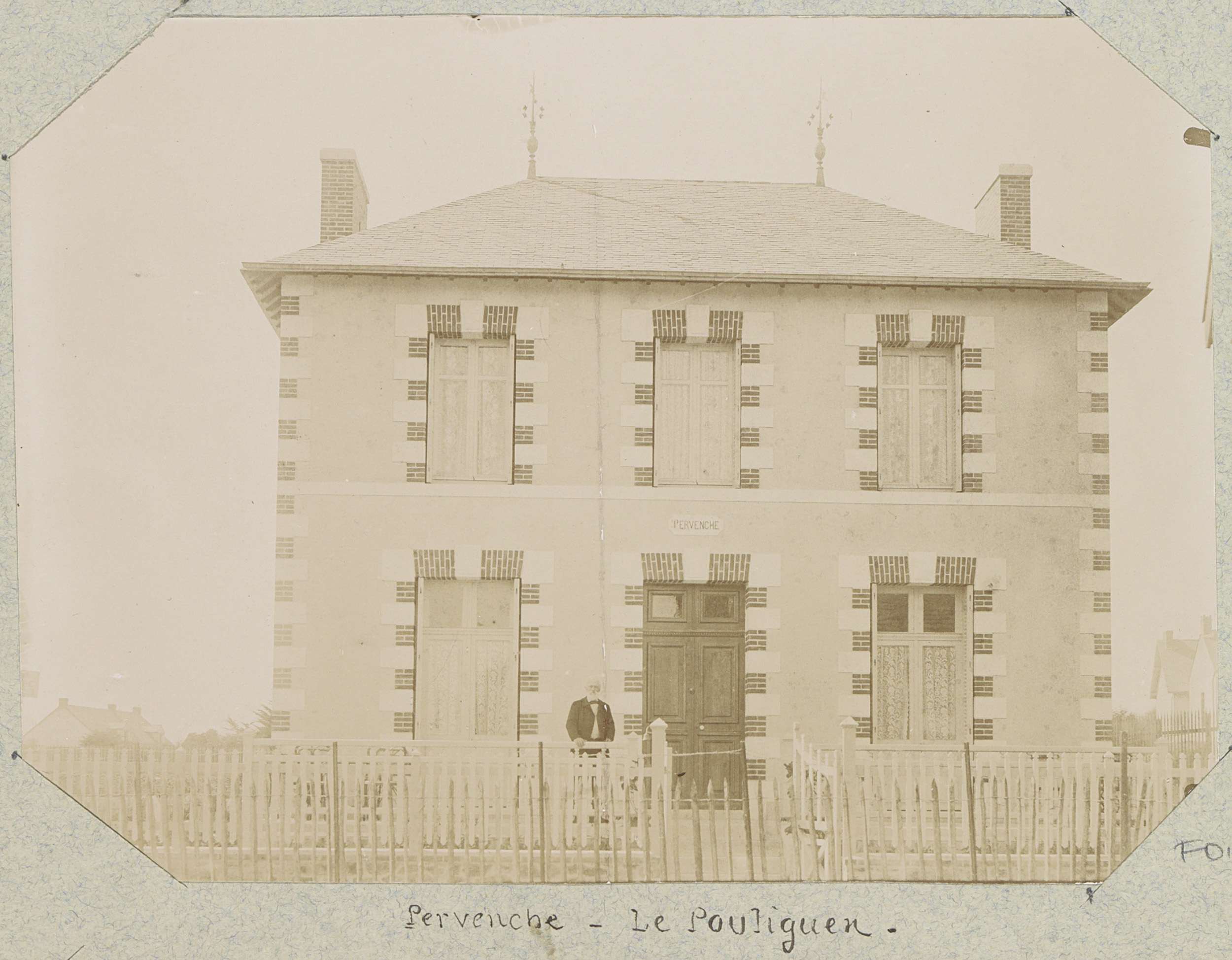 Man staand voor een huis genaamd 'Pervenche' in Le P...