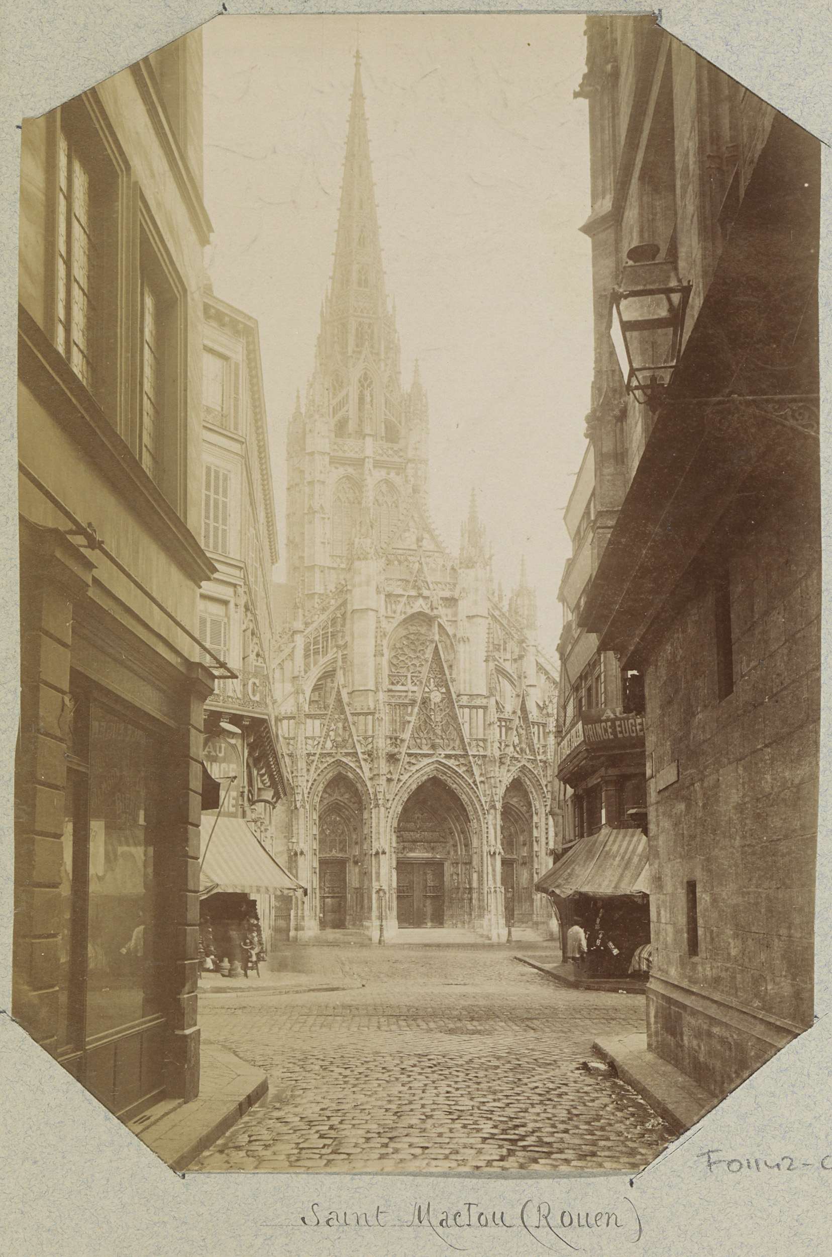 Kerk Saint-Maclou gezien door een straat in Rouen