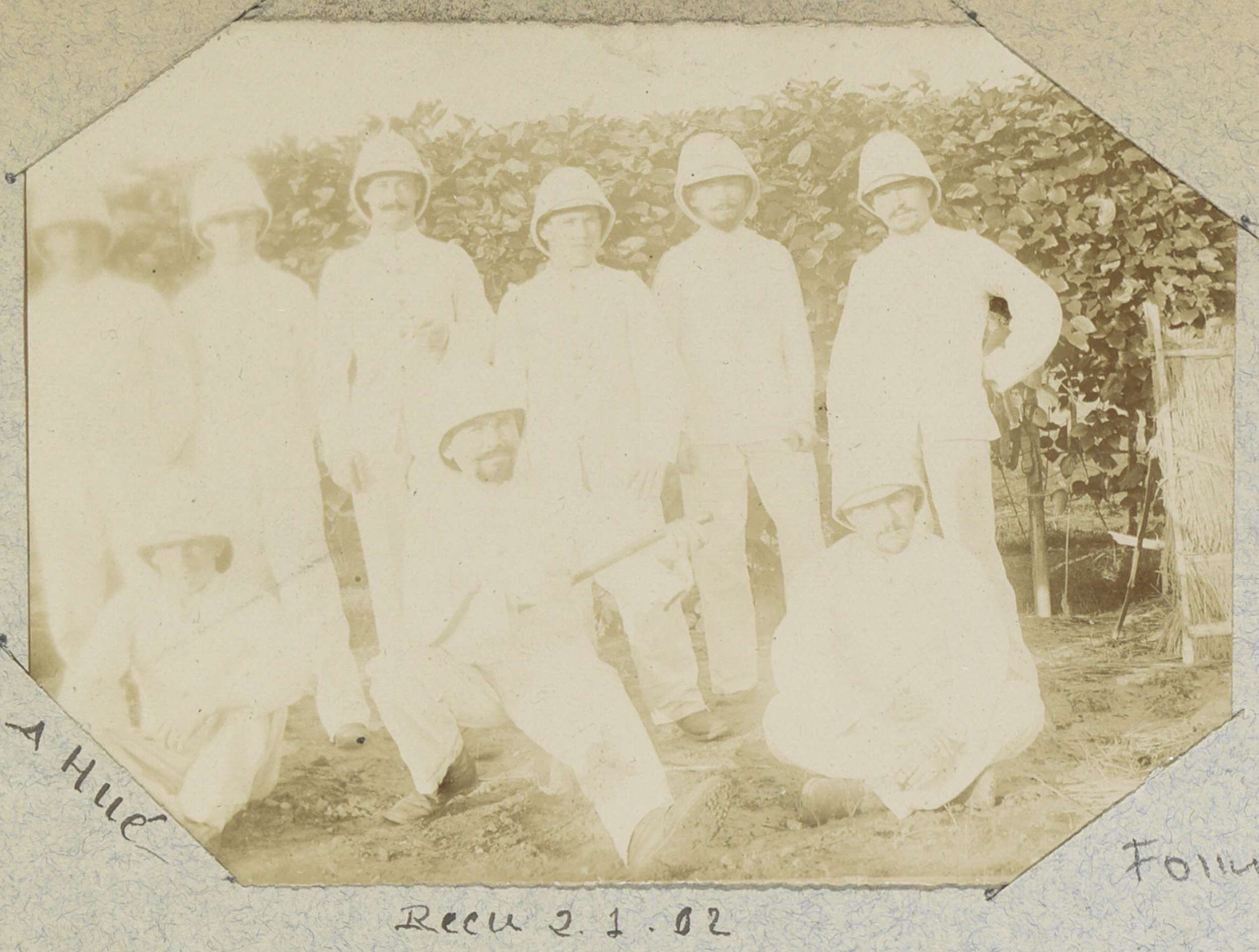 Groepsportret van negen mannen in tropenkostuum, ver...