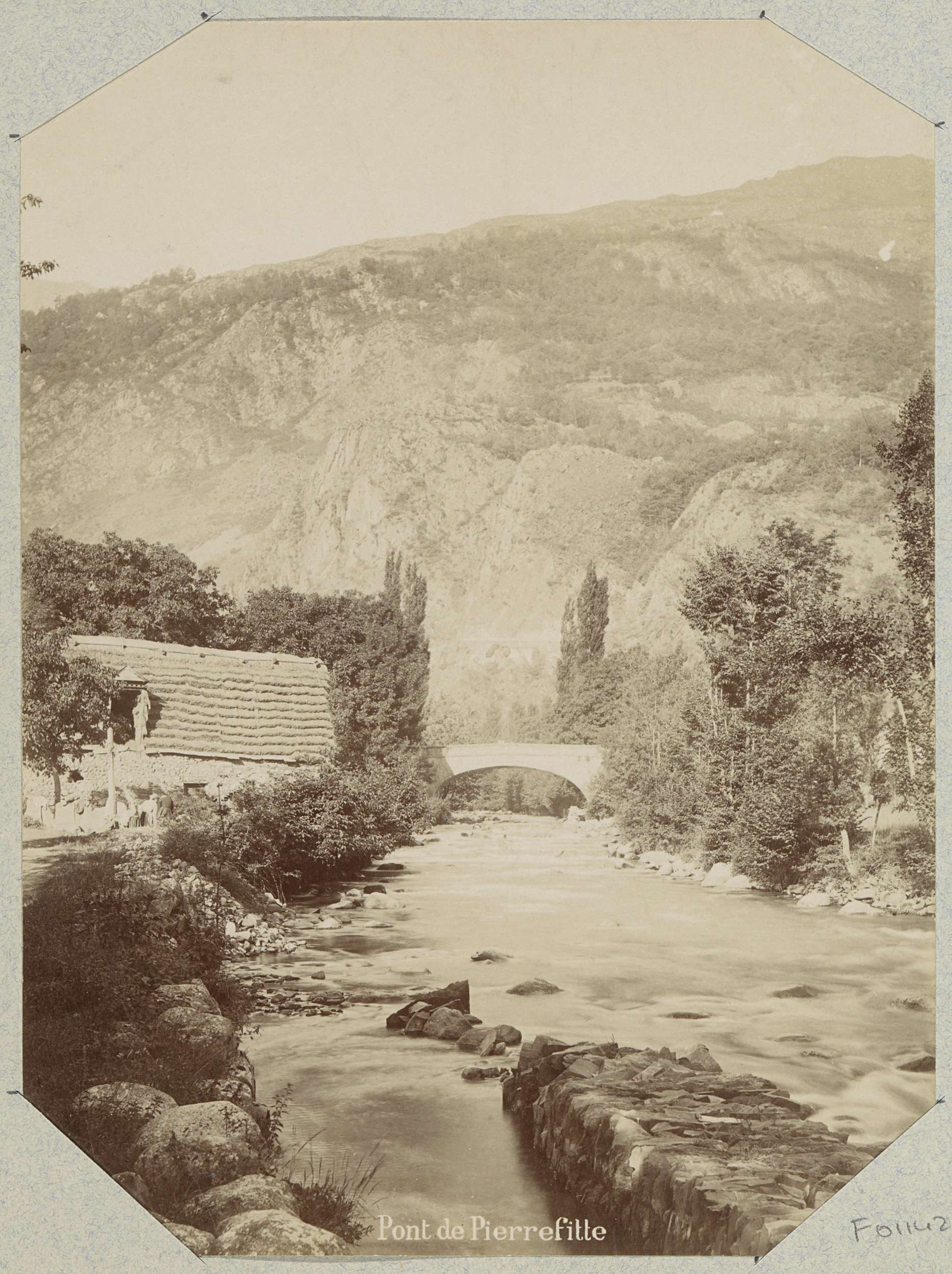 Gezicht op een rivier met brug in Pierrefitte in Fra...