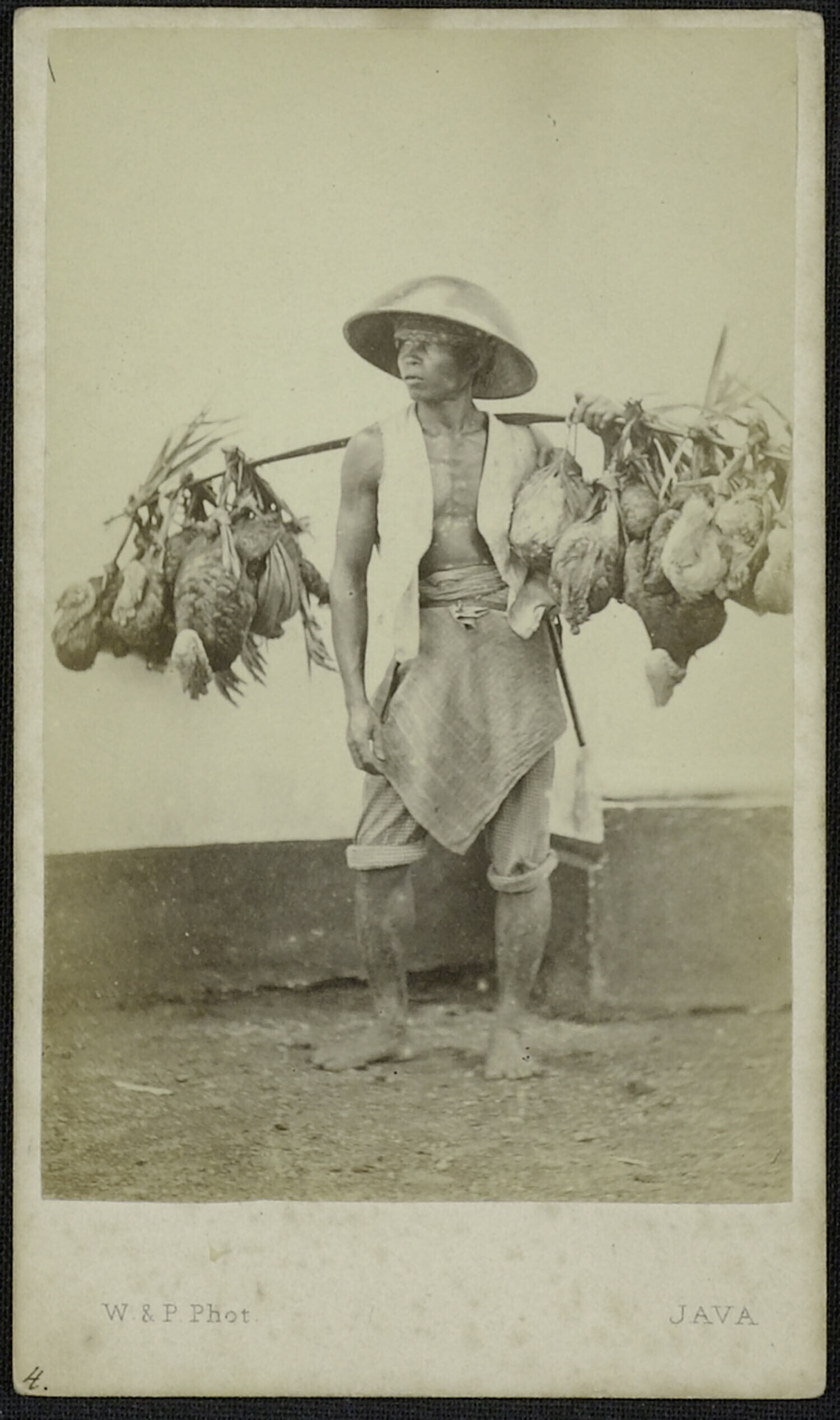 Javaanse kippenkoopman zijn handelswaar over de scho...