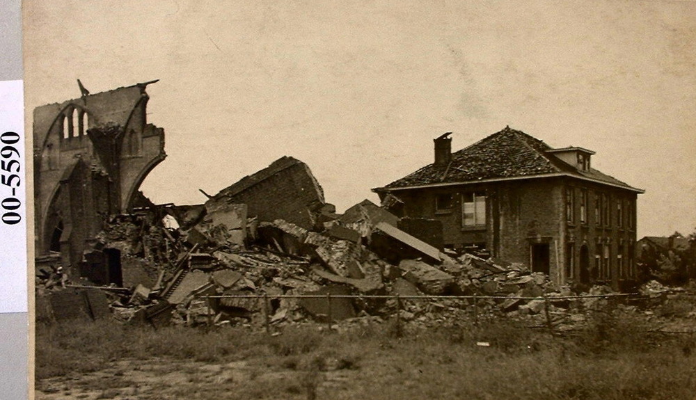 De verwoeste Zandse kerk de Pastorie is gespaard geb...