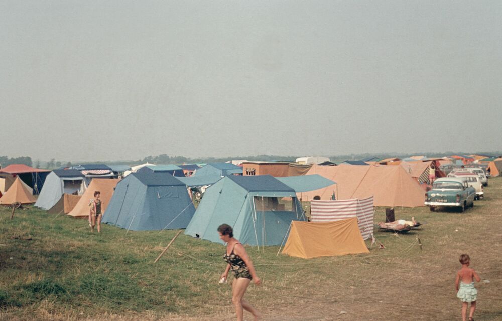 Tenten van kampeerders op een kampeerterrein aan het...