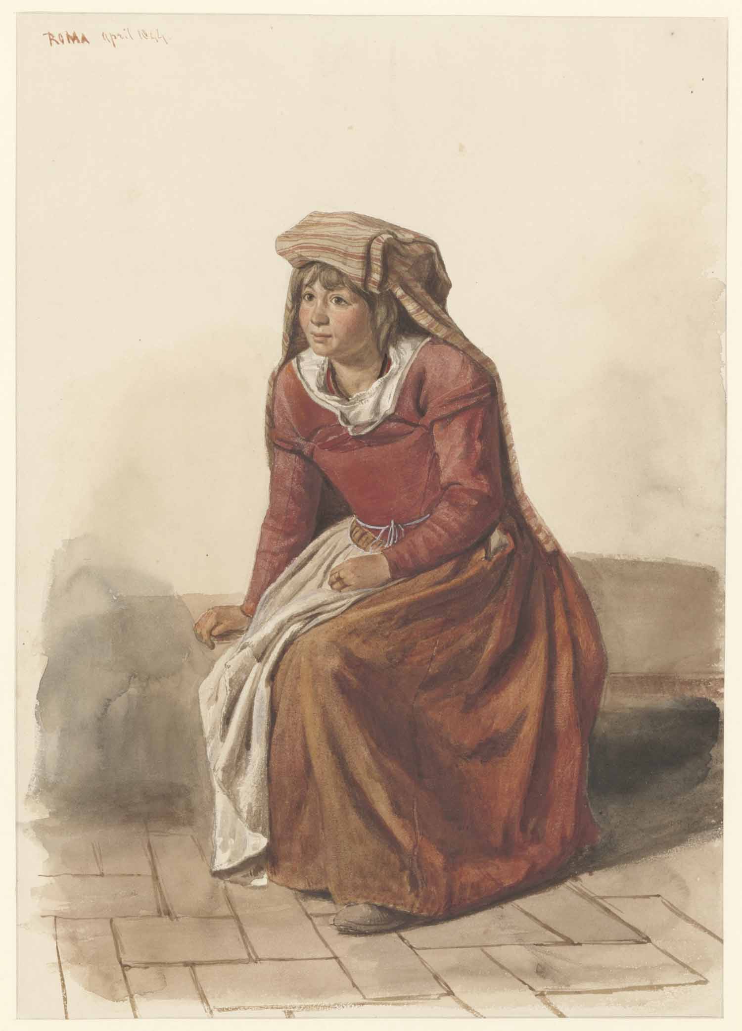 Zittende Romeinsche vrouw in roode jurk met een doek...