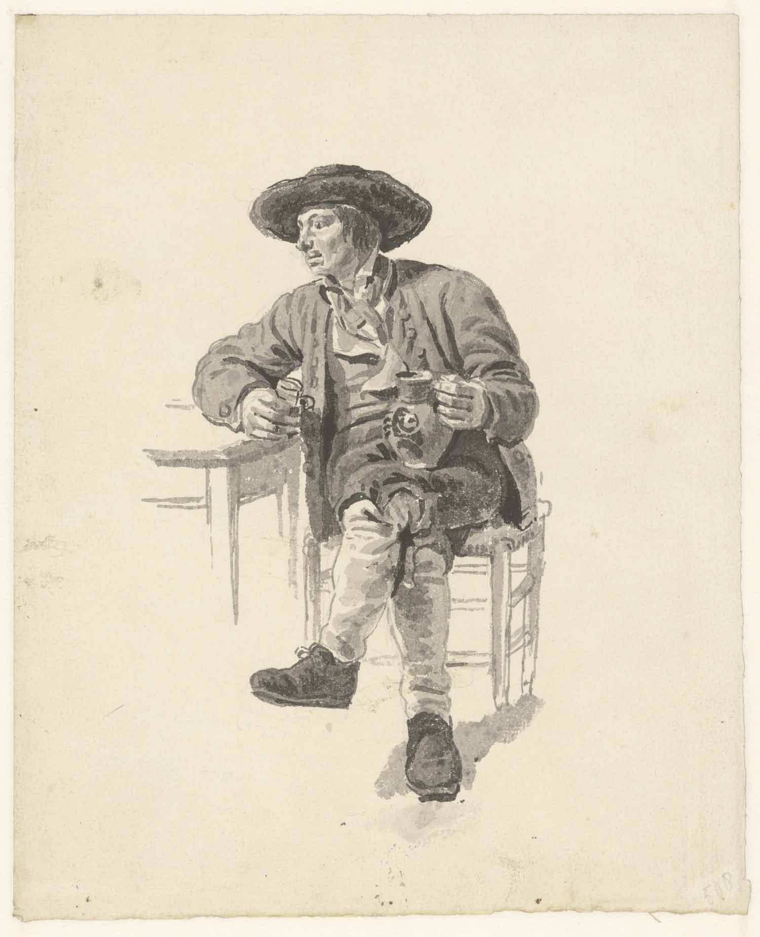 Zittende boer met bierkruik en glas