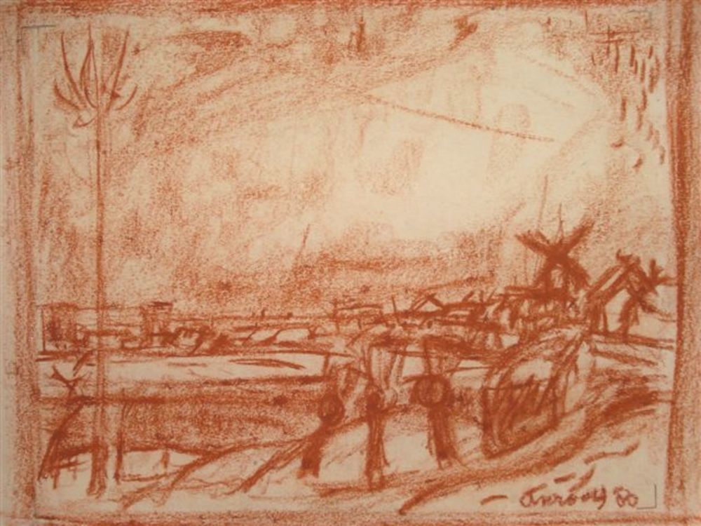 schets in bruin krijt,schip met dorp, periode 1940-1...