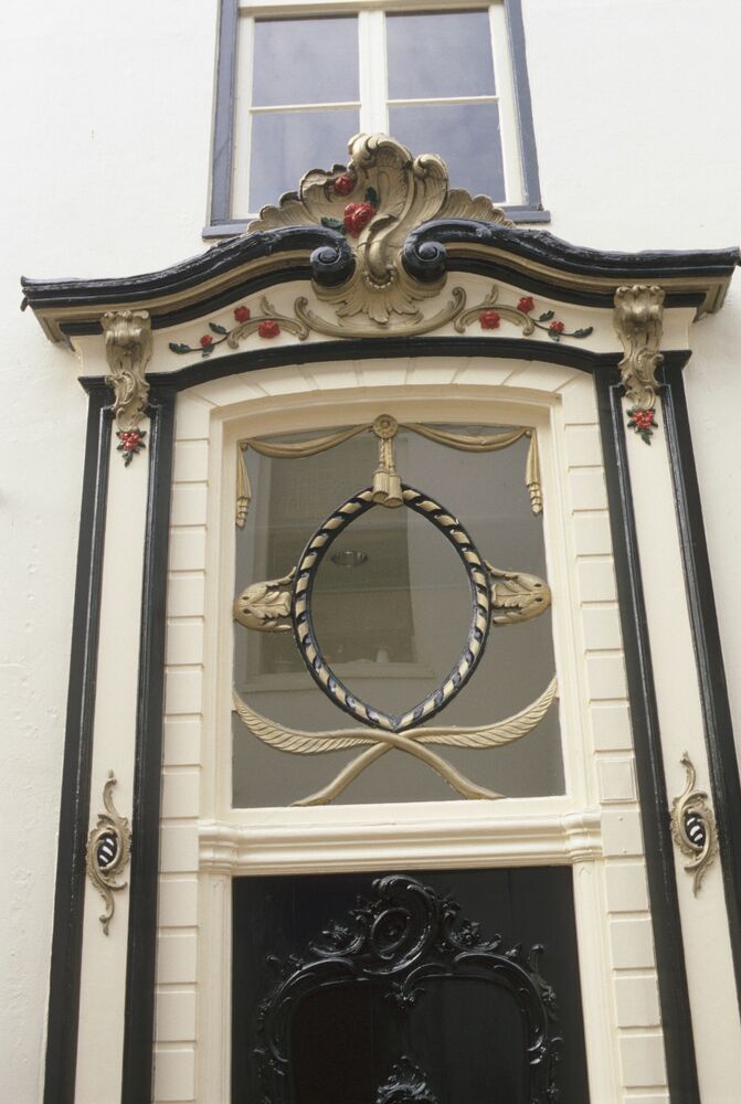 Geornamenteerde deurlijst en bovenlicht van het pand...
