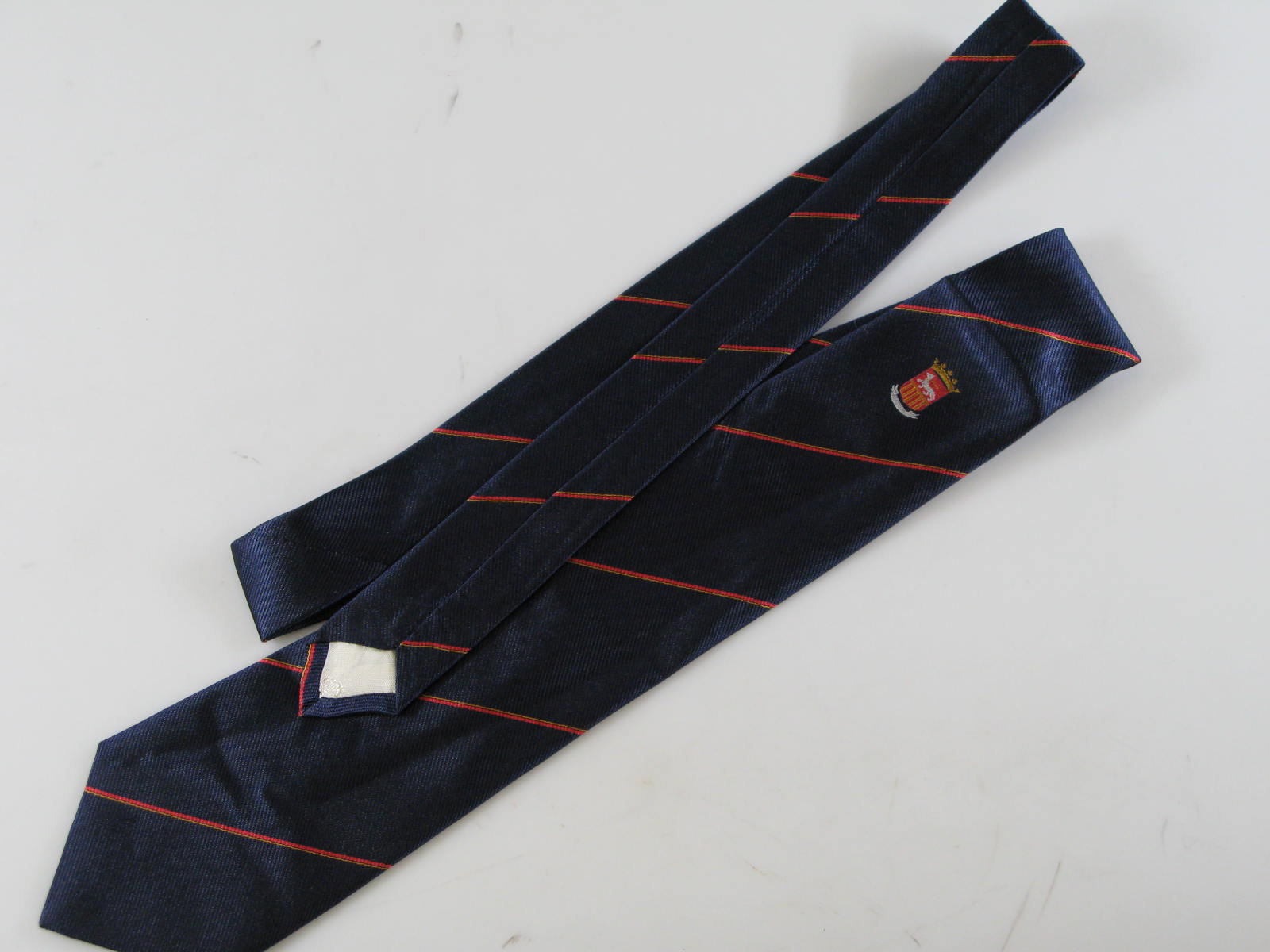 Blauwe stropdas met rode strepen en rood wapen