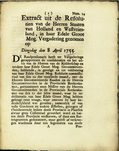 Extract uit resolutie, collaterale heffingen, 1755