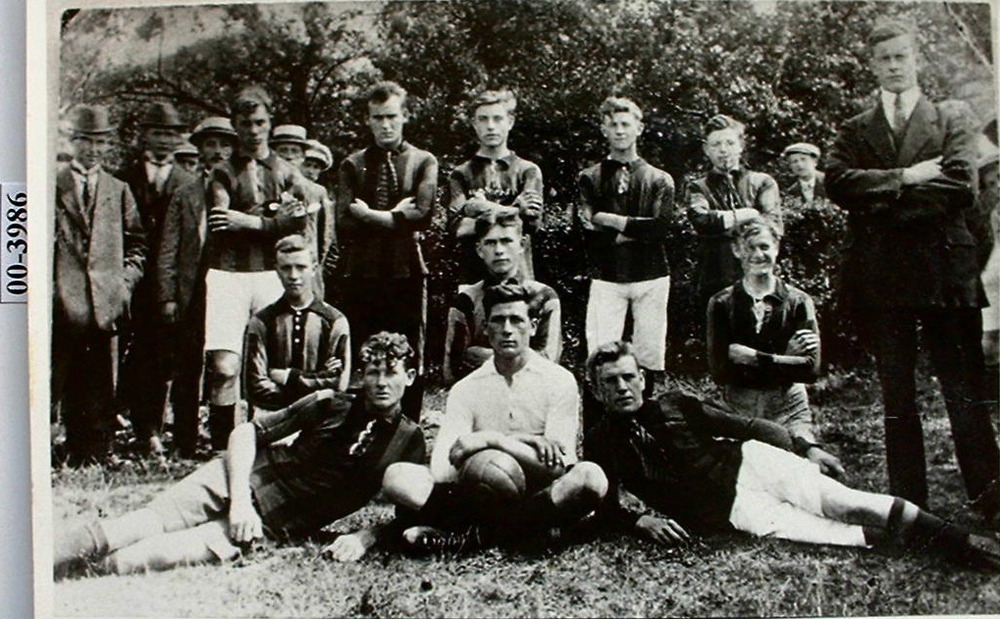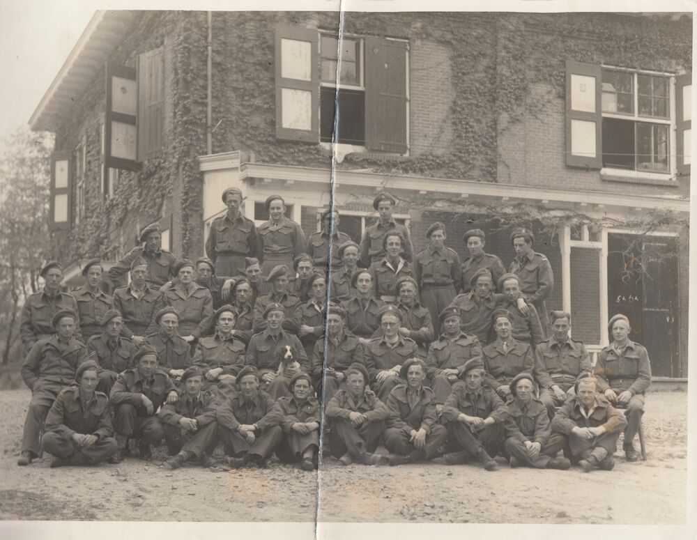 Groepsfoto van 45 Engelse soldaten voor een villa