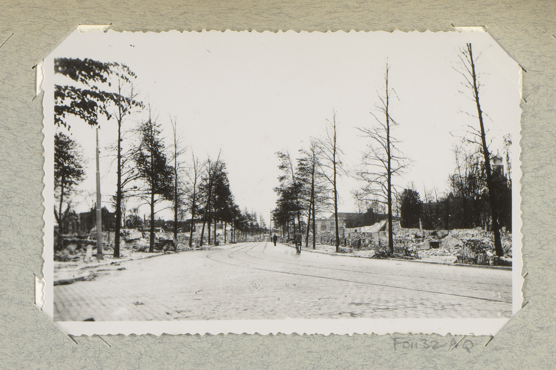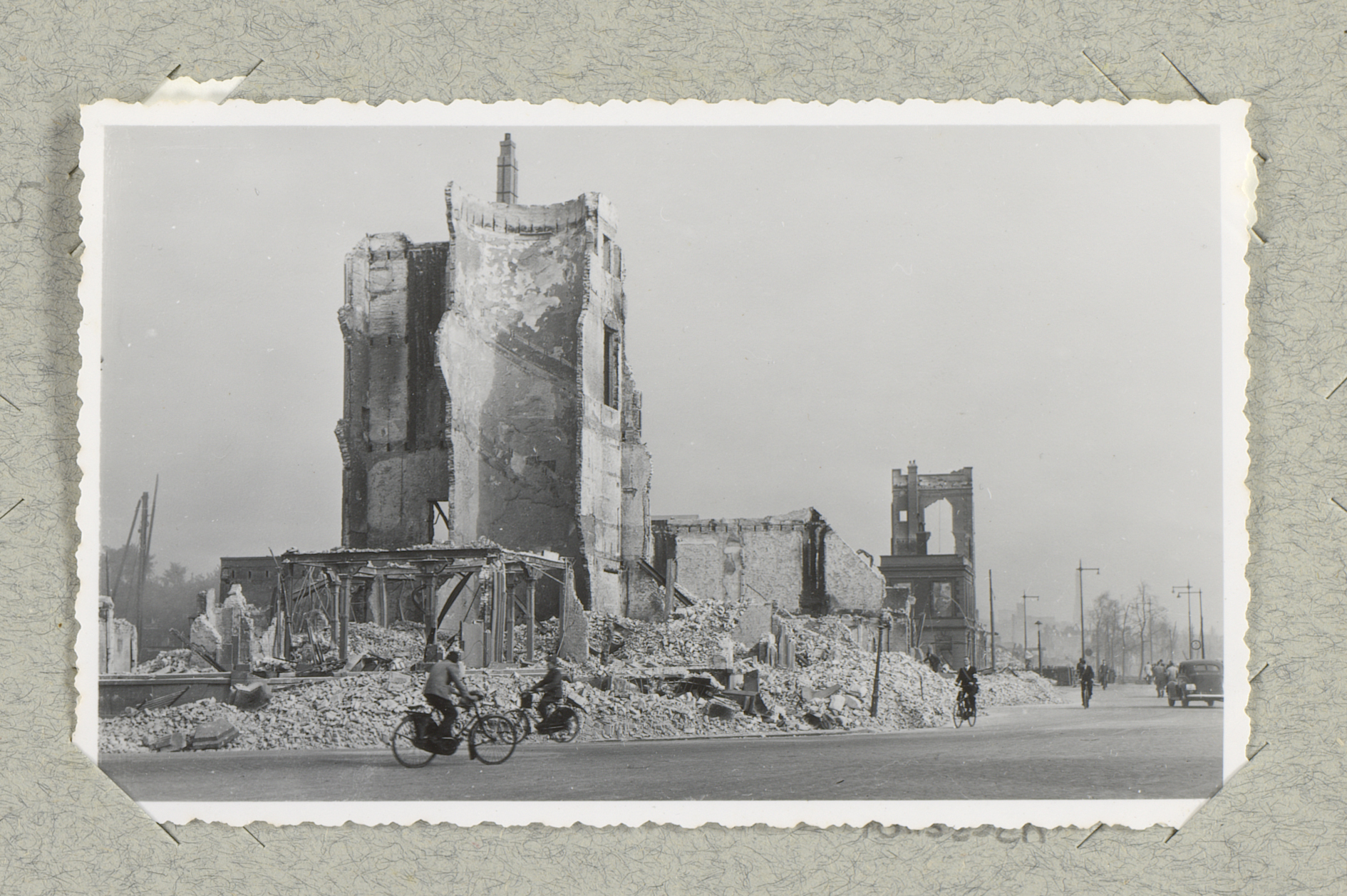 Fietsers bij ruïnes van de Marinierskazerne aan het ...