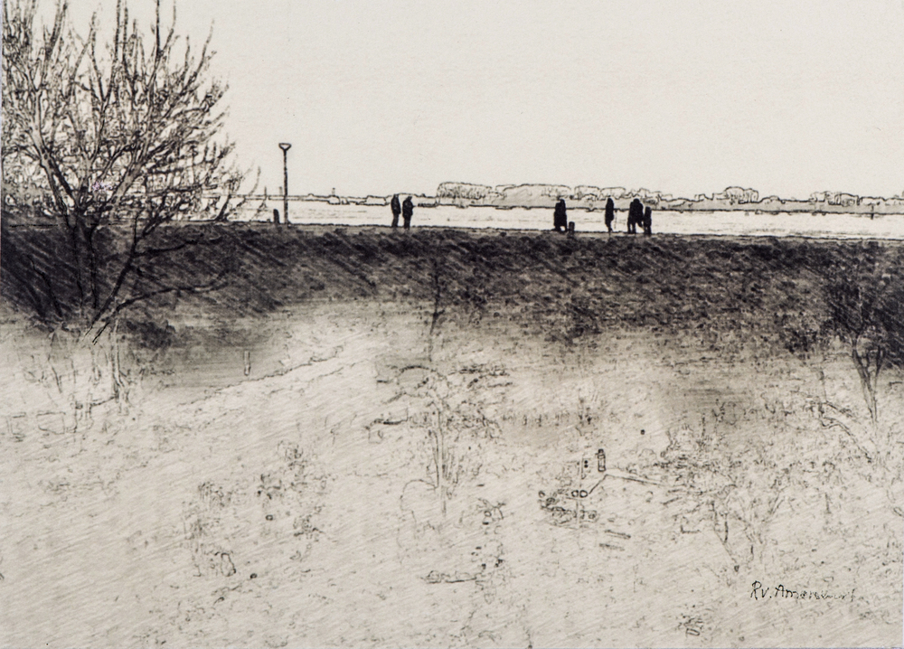 Prent, Wandelaars op de Ophemertsedijk - Tiel (winter)