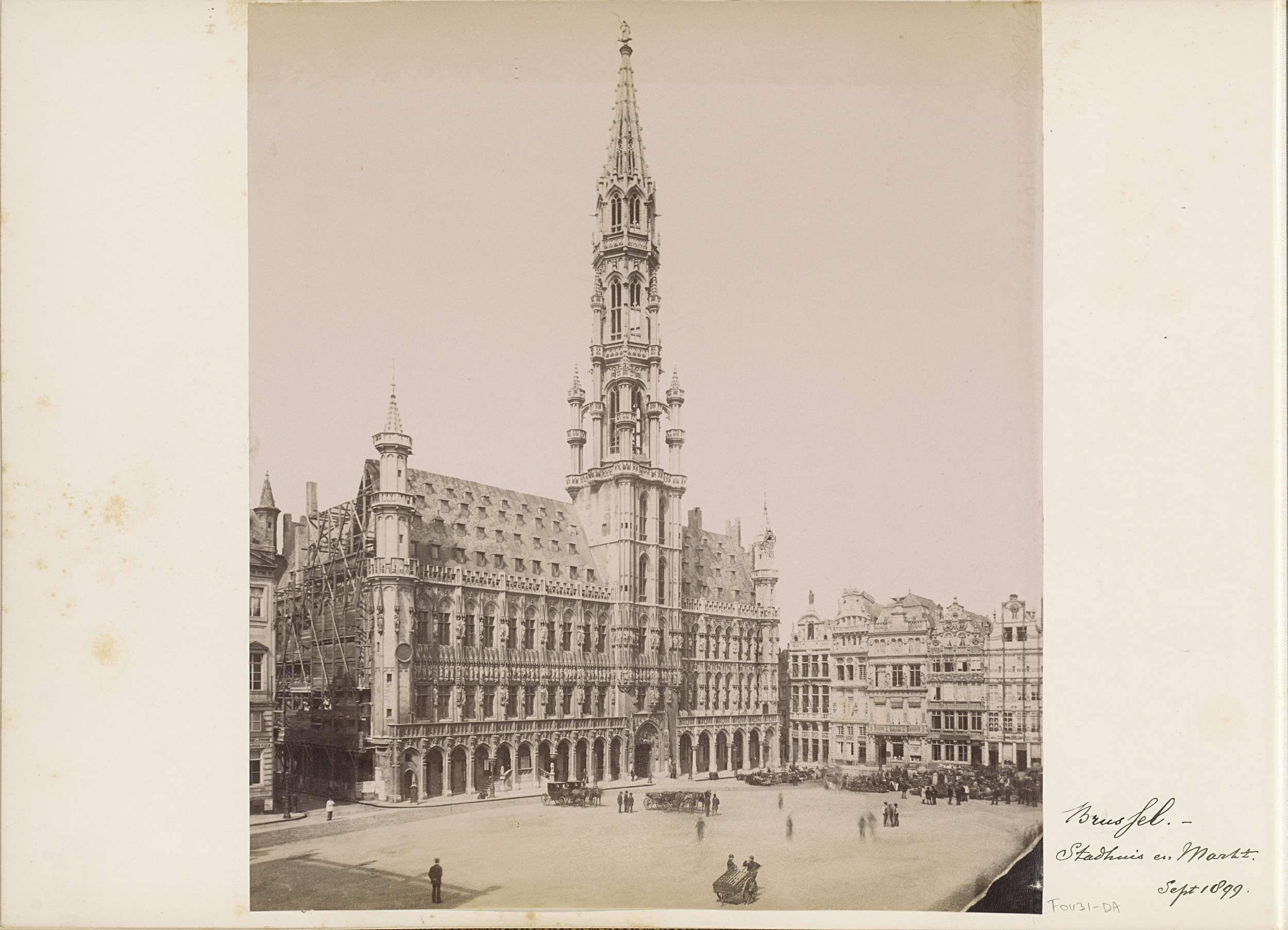 Gezicht op het stadhuis en gildehuizen aan de Grote ...