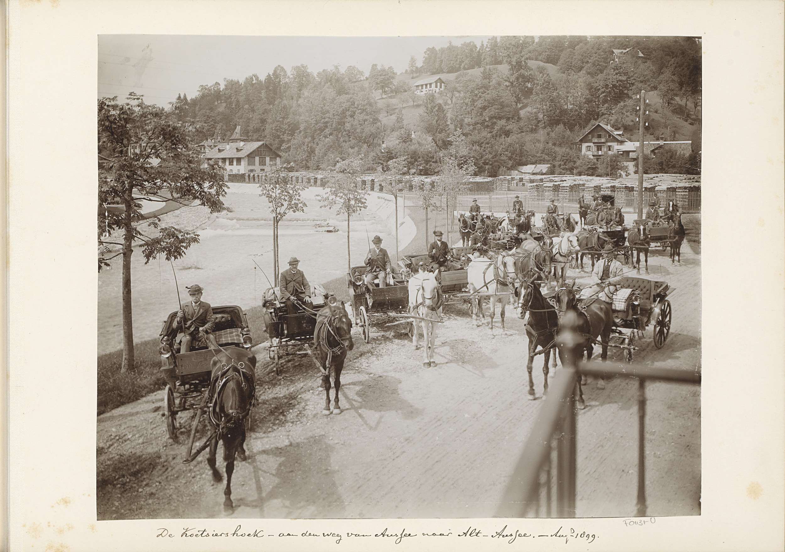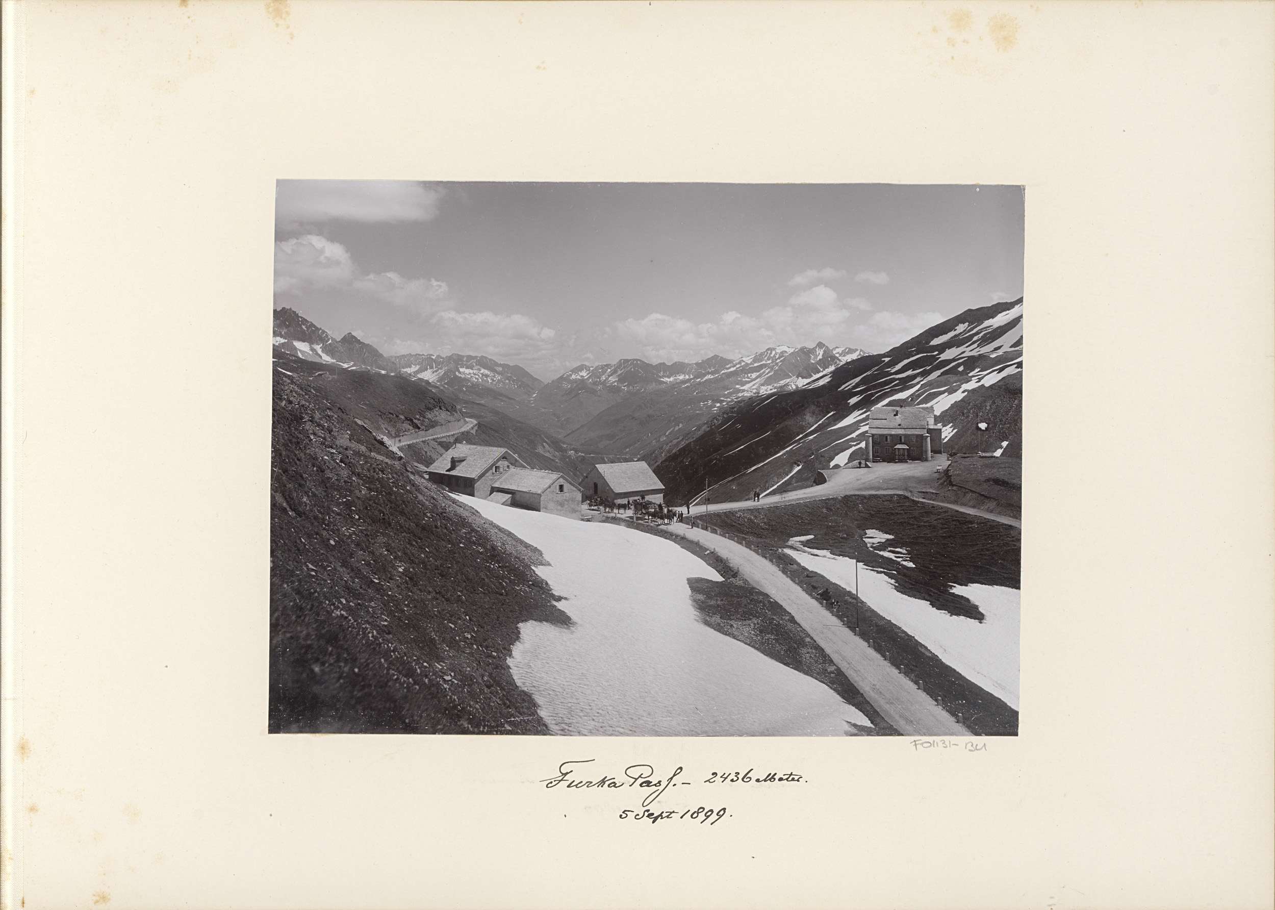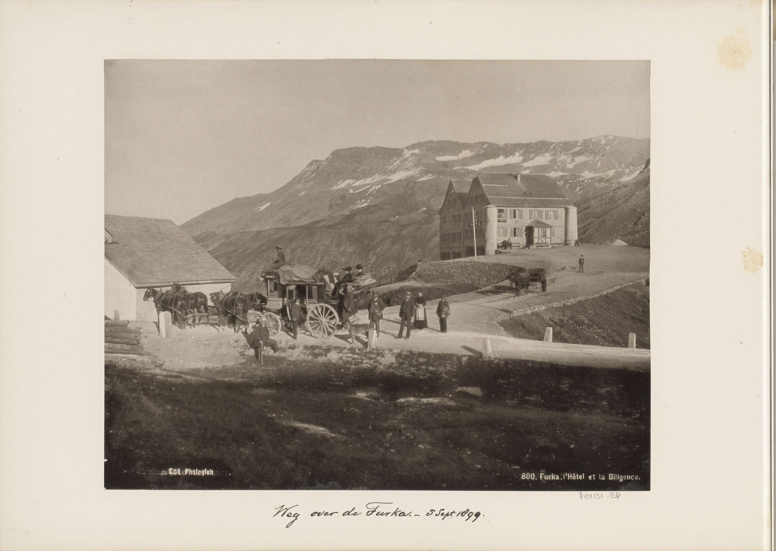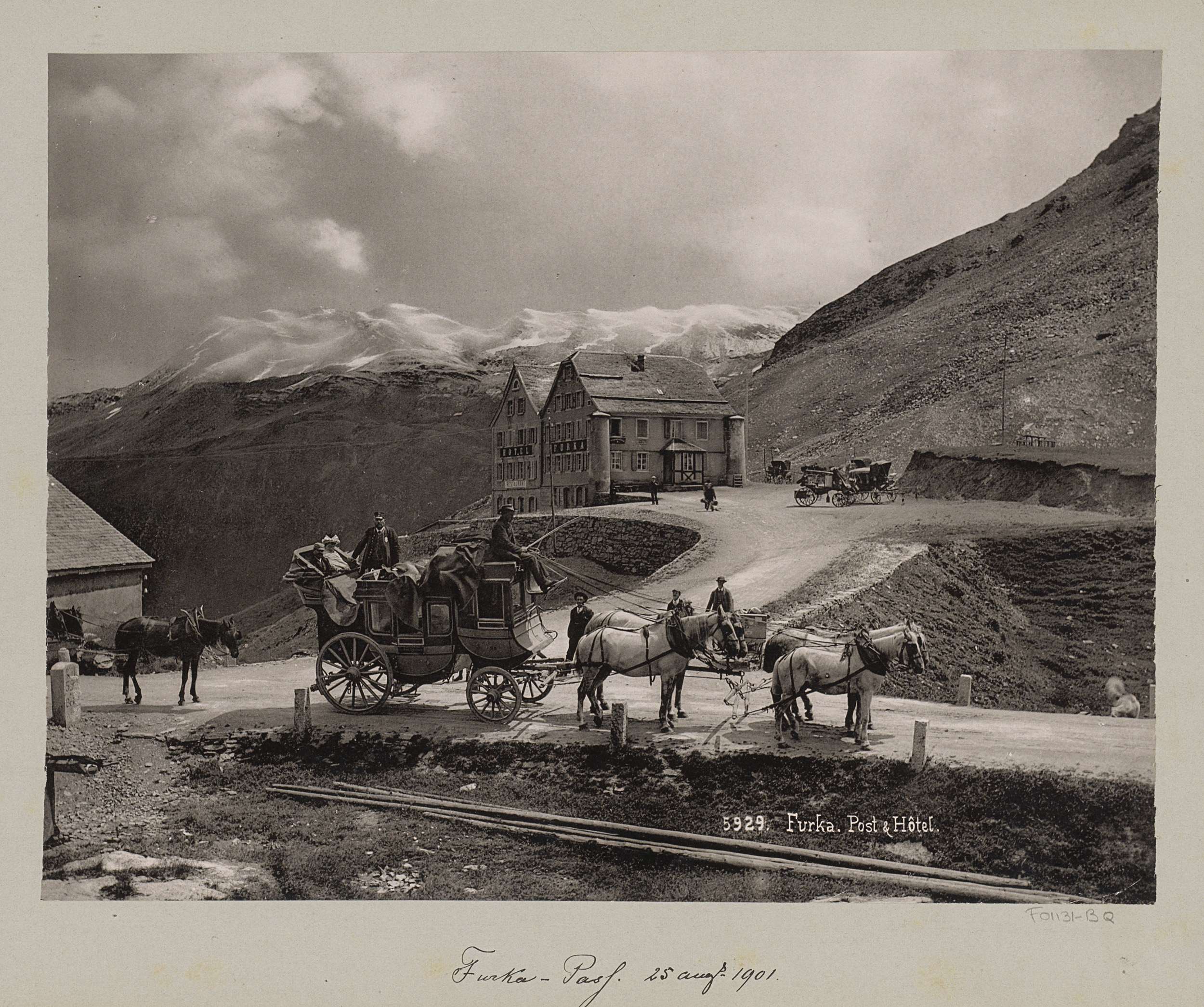 Reizigers en paardenkoets bij Hotel Furka aan de Fur...