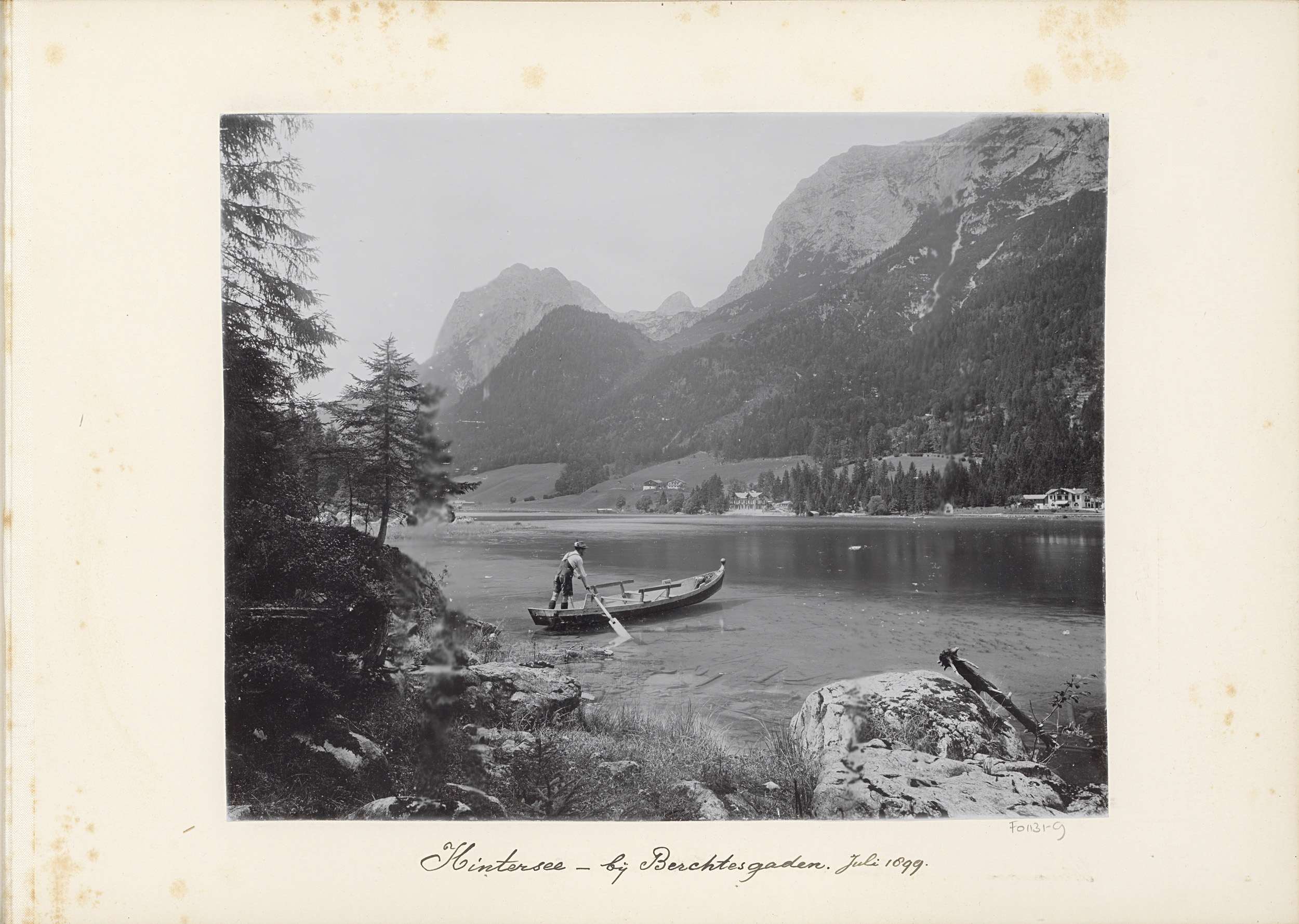 Man in een roeiboot op de Hintersee bij Berchtesgaden