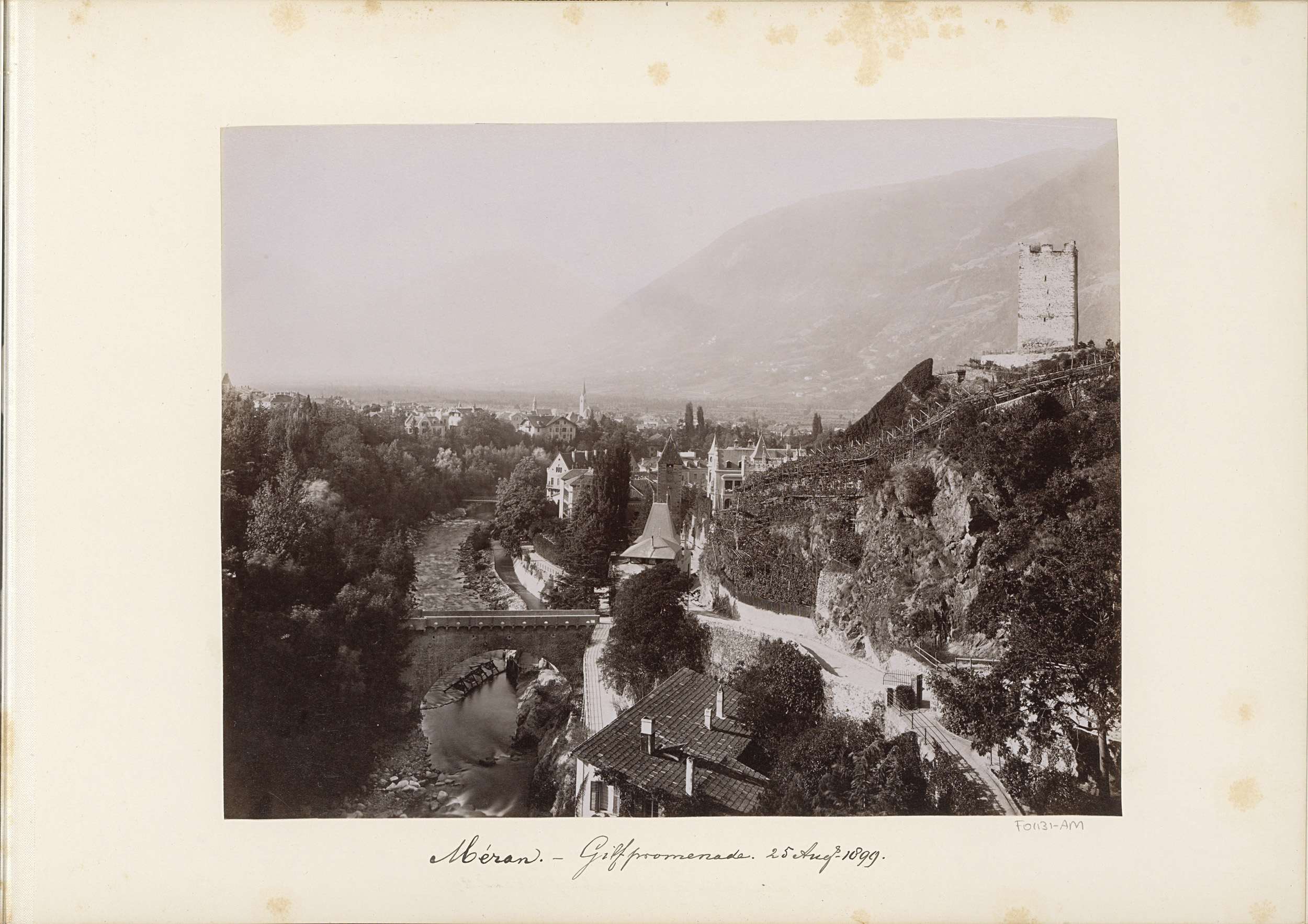 Gezicht op Merano met de Gilfpromenade, brug en toren