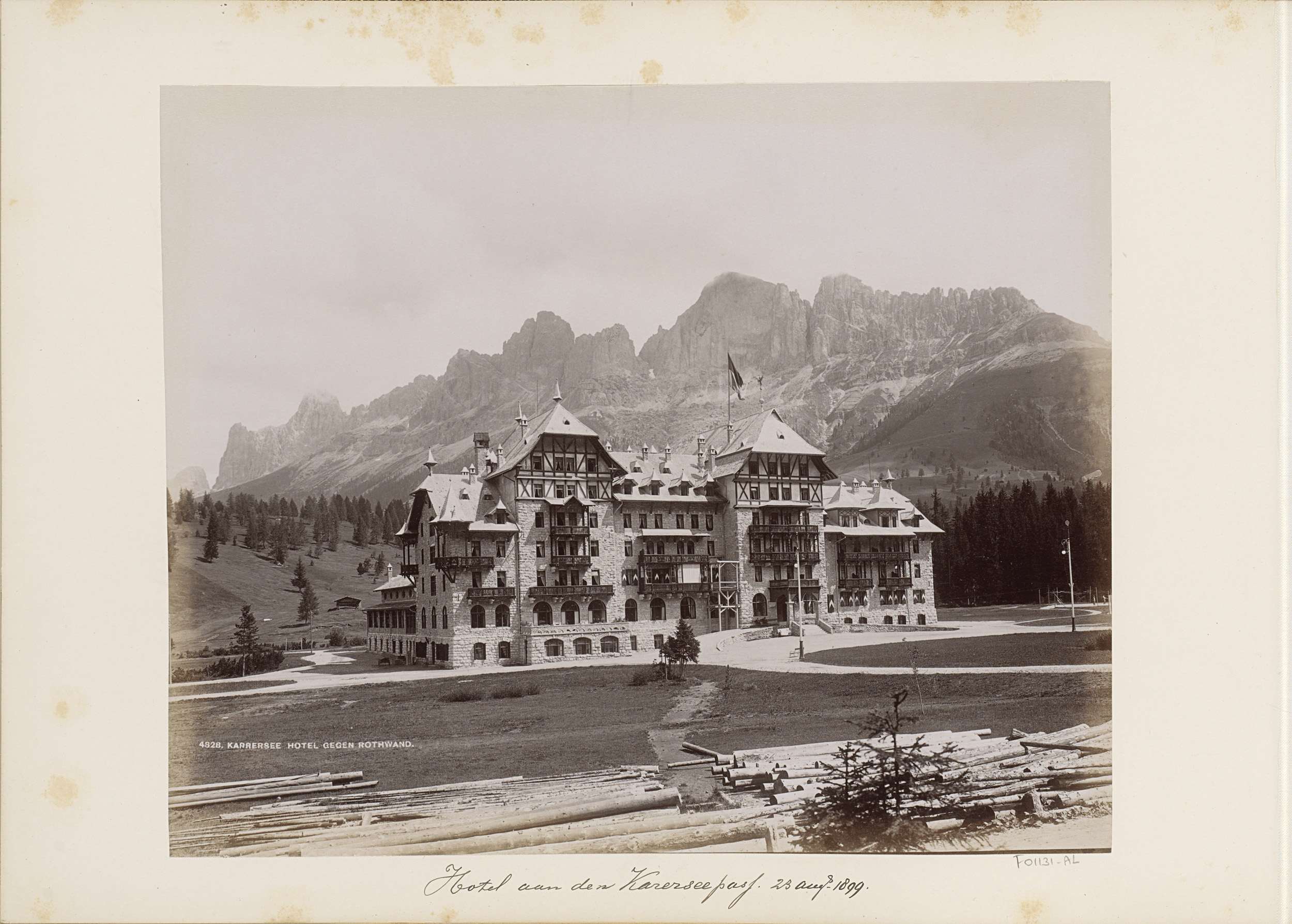 Exterieur van Hotel Karersee met op de achtergrond d...