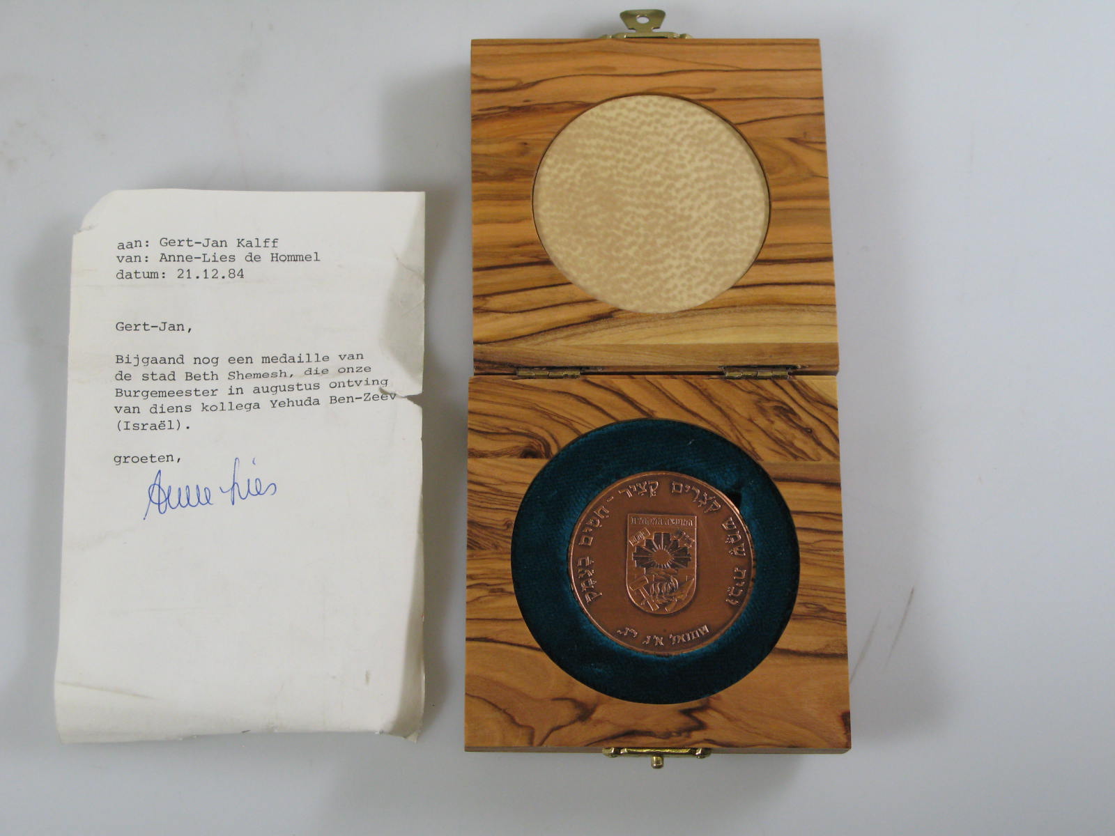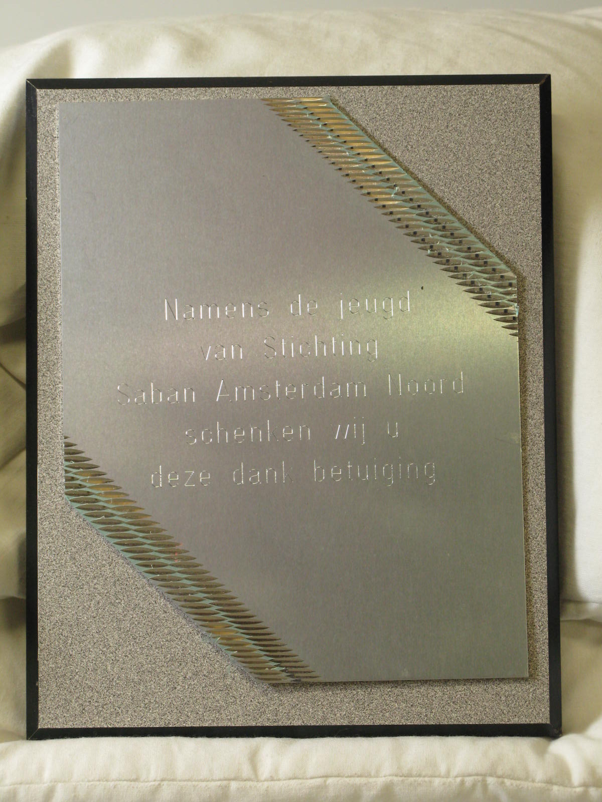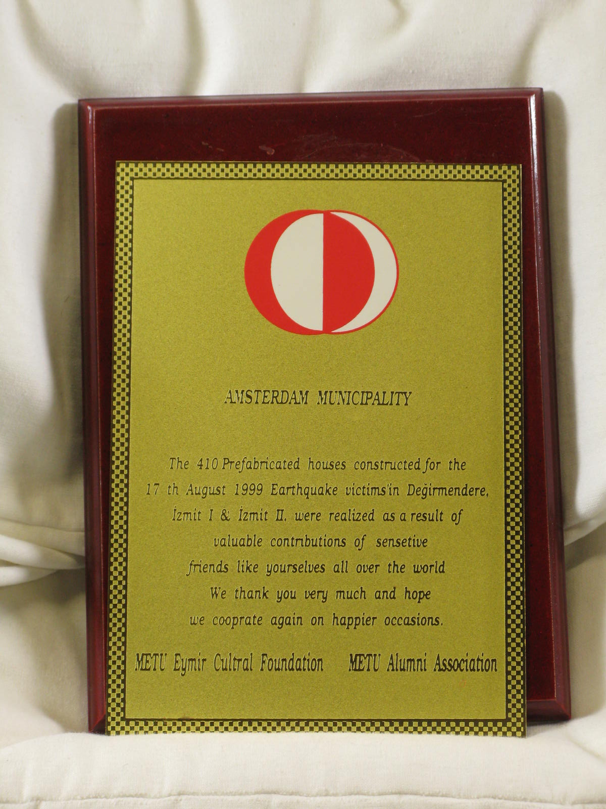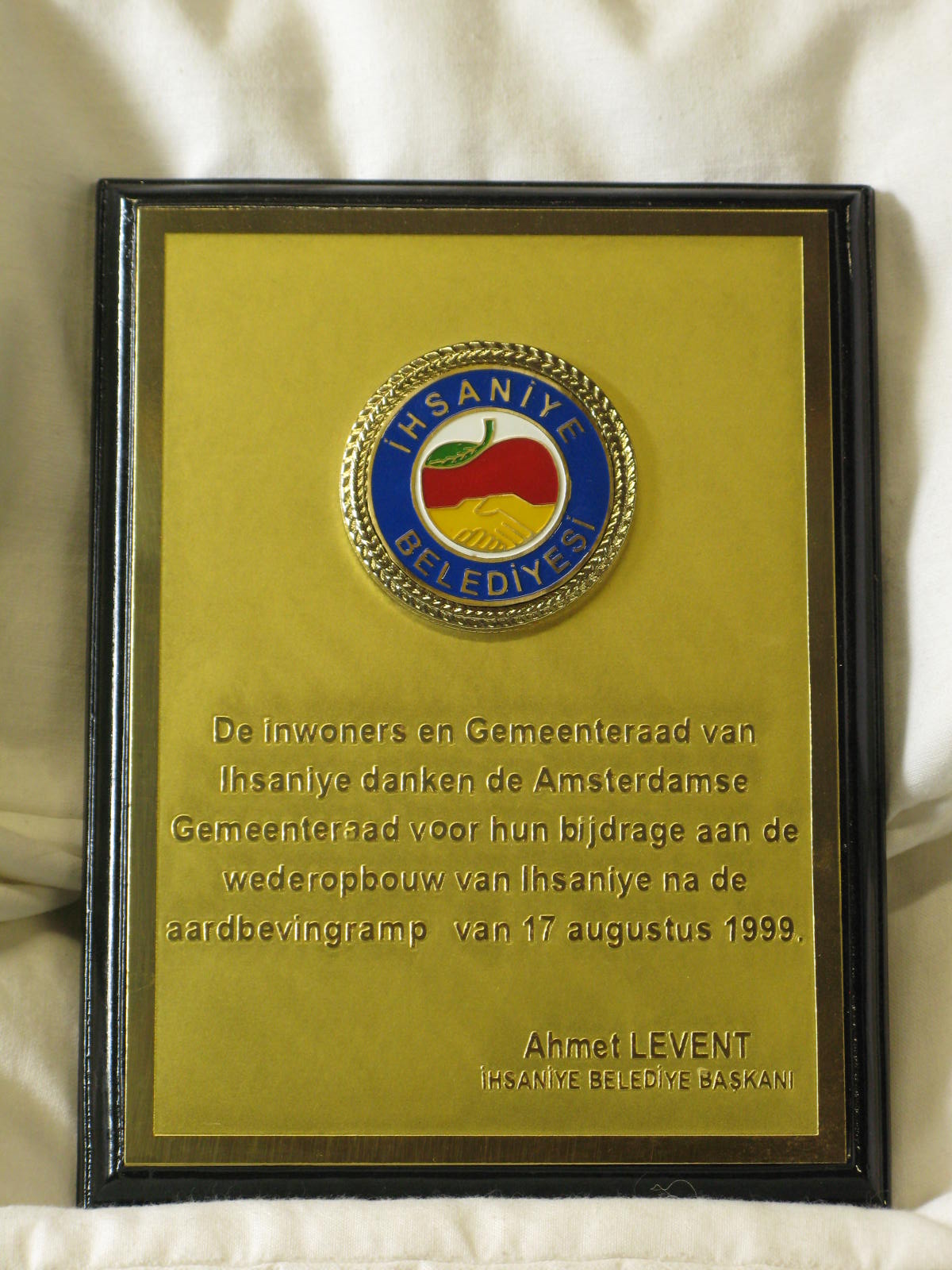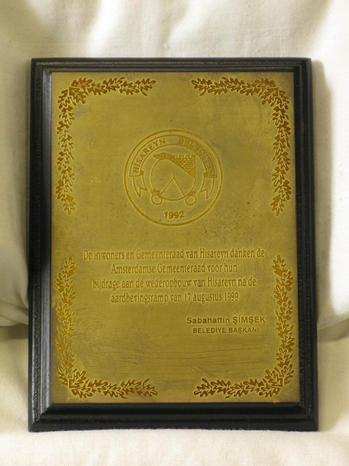 Plaquette als dank voor bijdrage wederopbouw Hisarey...