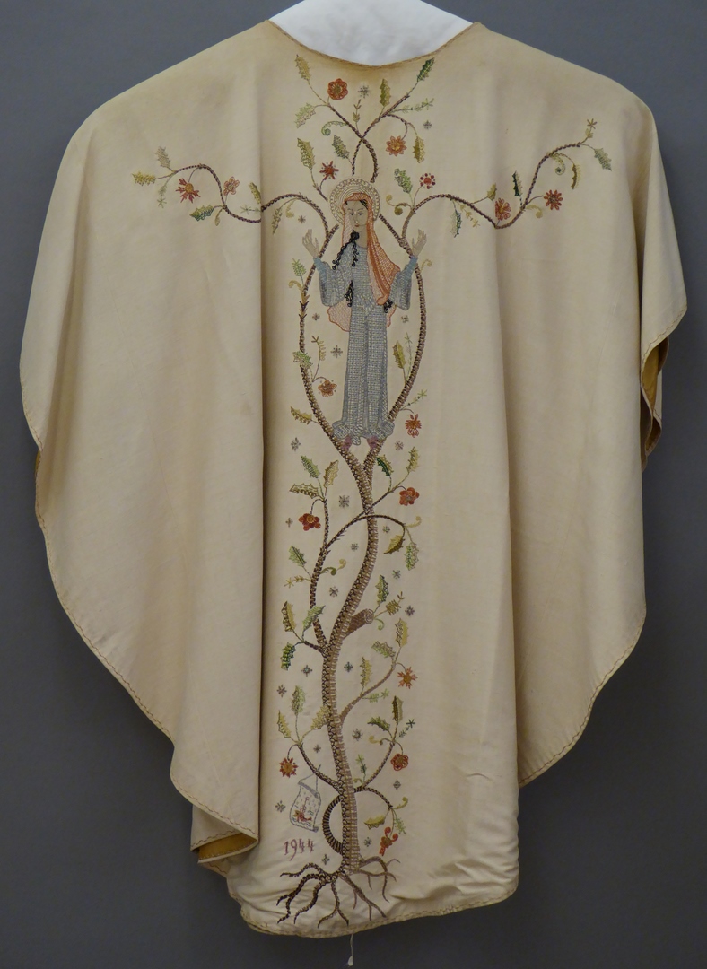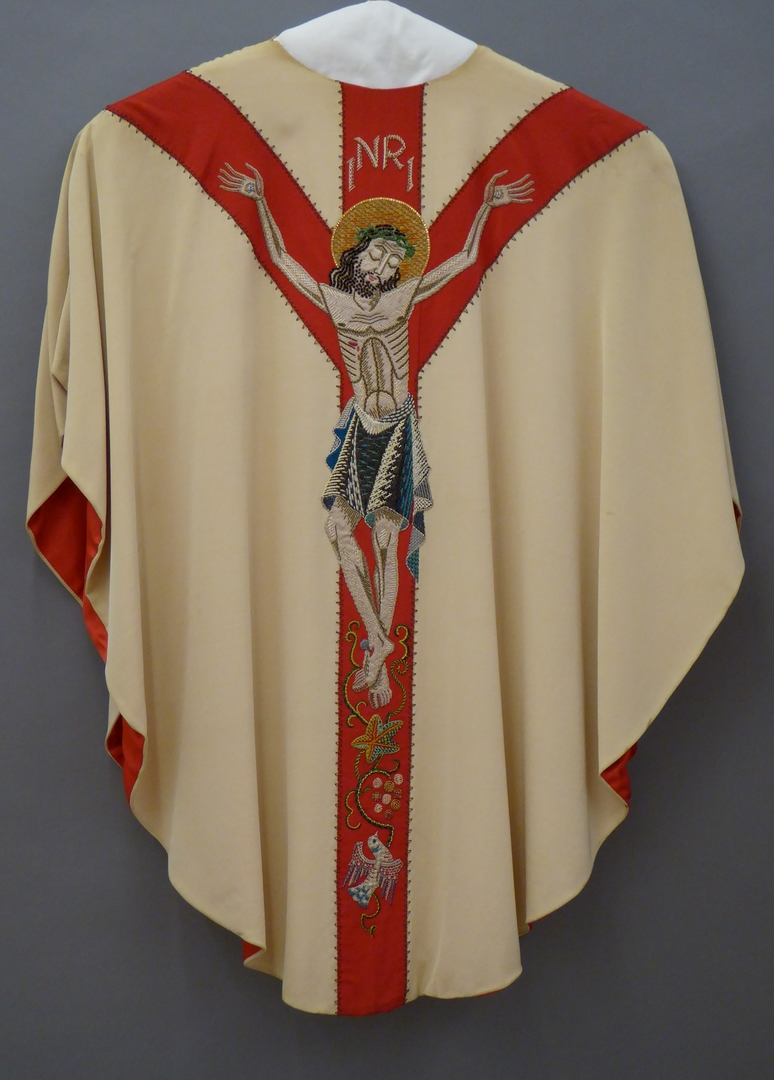 Witte (crème) kazuifel met rood gaffelkruis, kruisig...