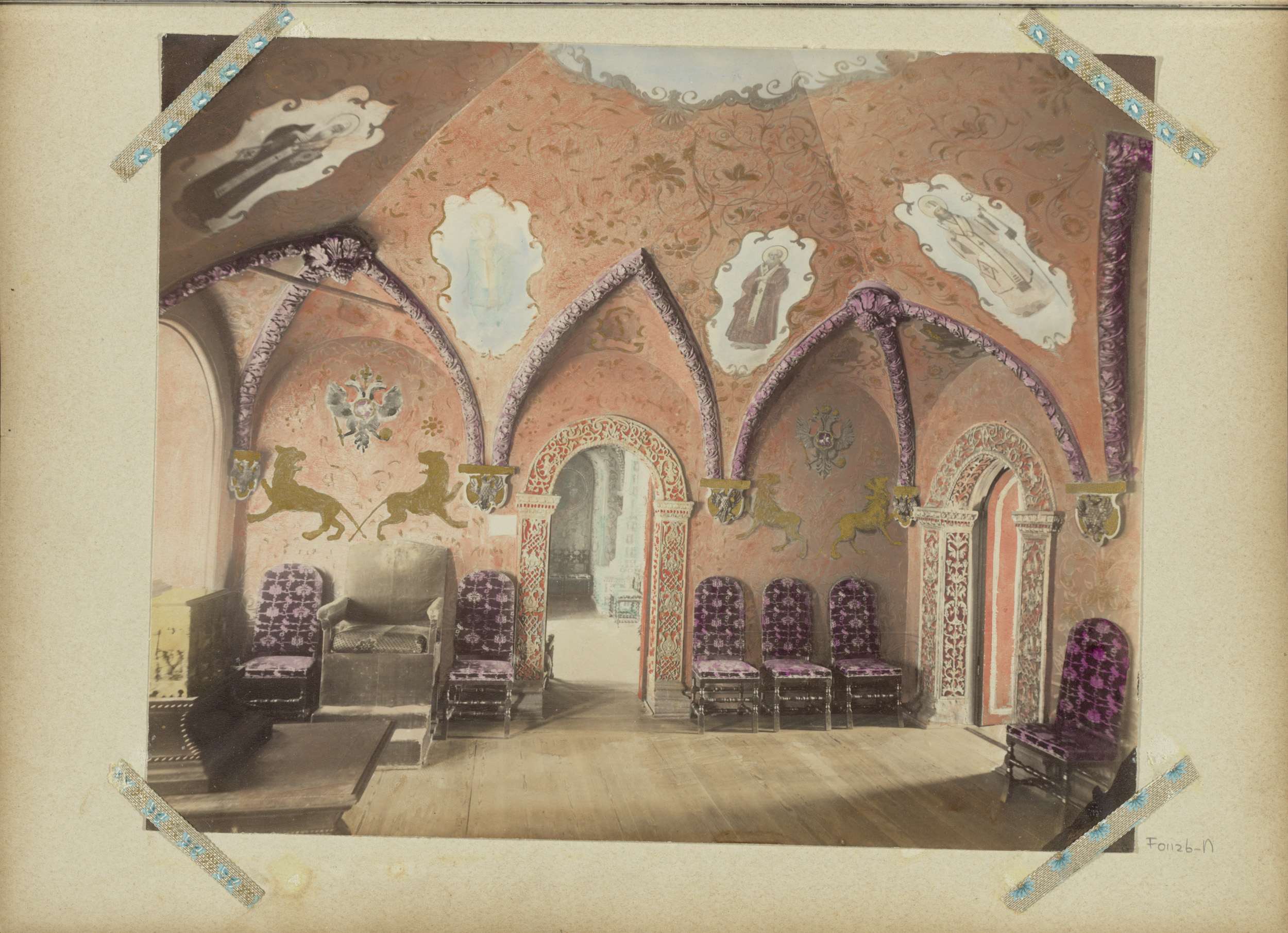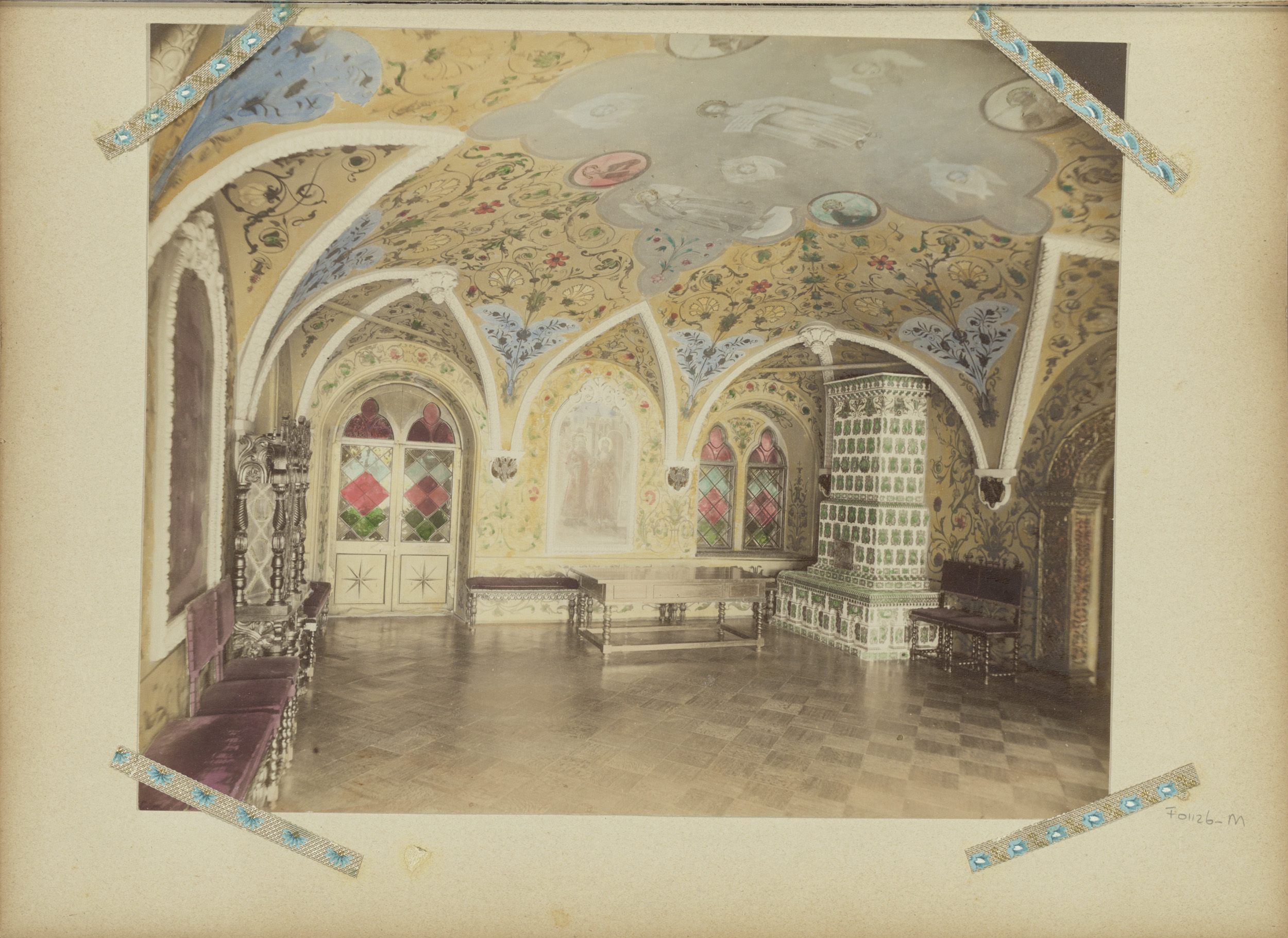 Interieur met gedecoreerd plafond, iconen en kachel,...