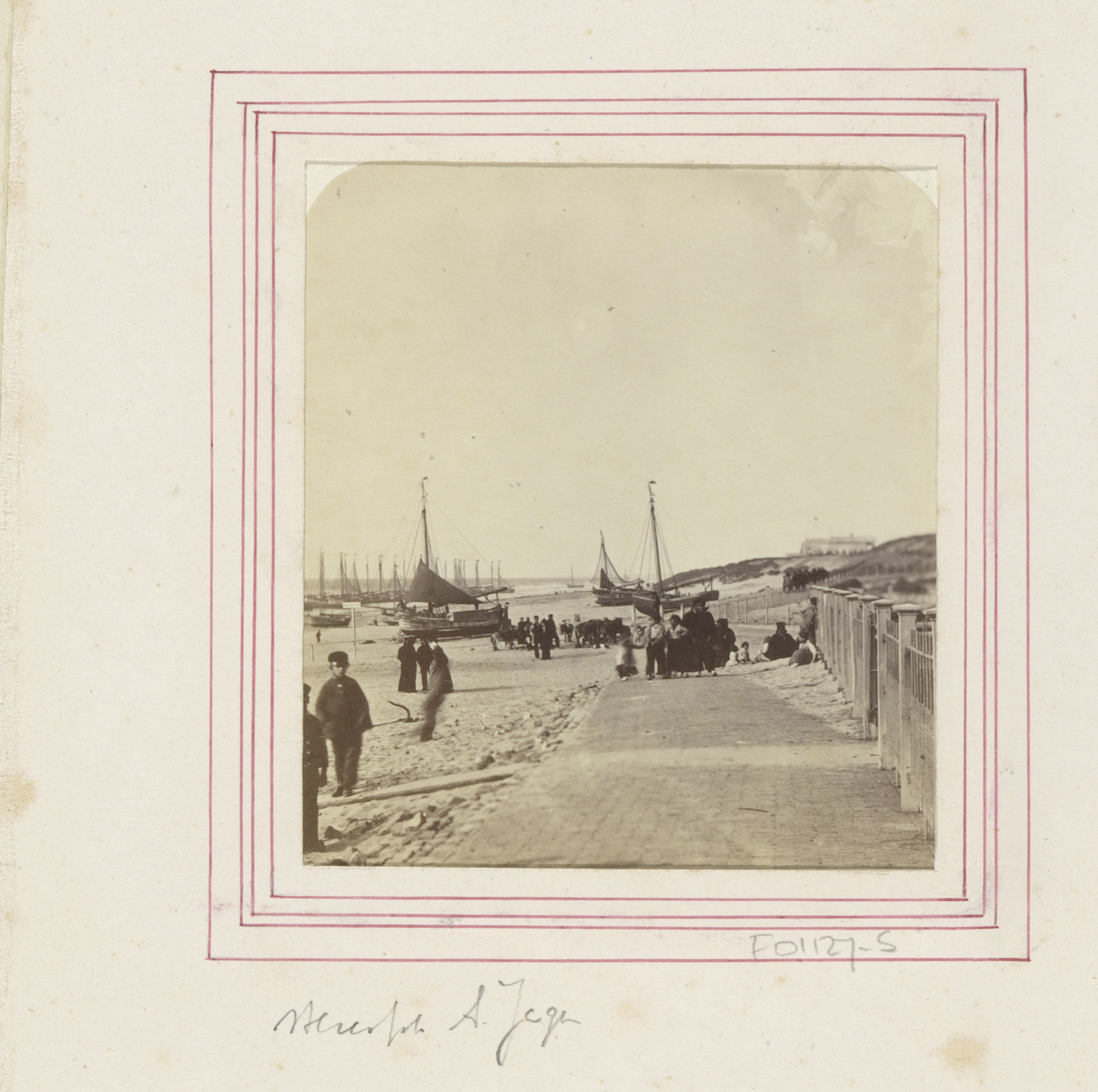 Bomschuiten en volk op het strand van Scheveningen