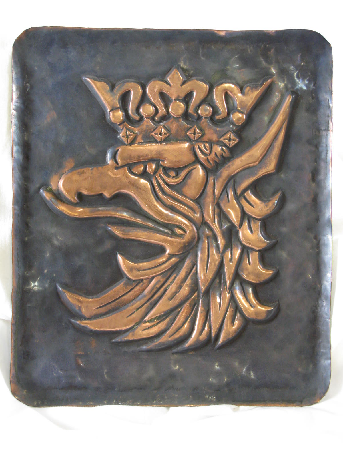 Koperen plaquette met drakenkop