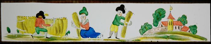 Handgeschilderde lantaarnplaat met oogstende boeren