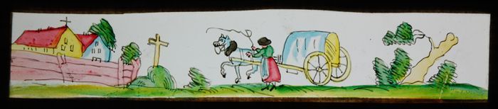 Handgeschilderde lantaarnplaat met huifkar en klooster