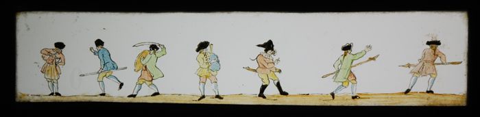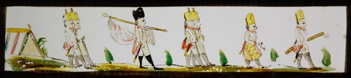 Handgeschilderde lantaarnplaat met marcherende soldaten