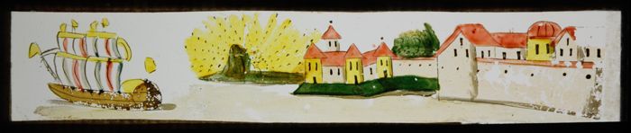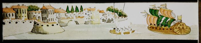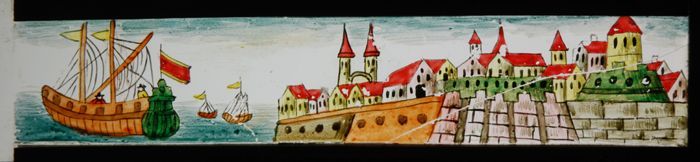 Handgeschilderde lantaarnplaat met havenstad en zeil...