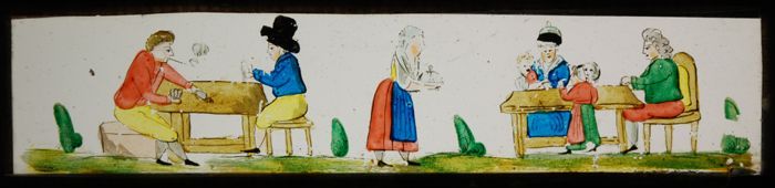 Handgeschilderde lantaarnplaat met kaartende mannen ...