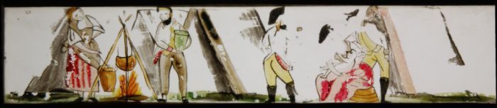 Handgeschilderde lantaarnplaat met vrouwen en soldaten