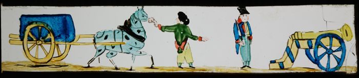 Handgeschilderde lantaarnplaat met kanon, soldaten e...