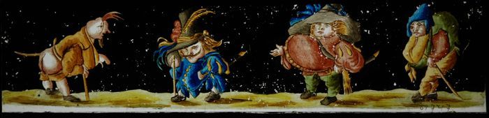 Handgeschilderde lantaarnplaat met carnavaleske optocht