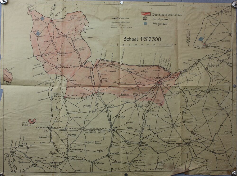 Kaart Normandie 1:312.500 deels ingekleurd.