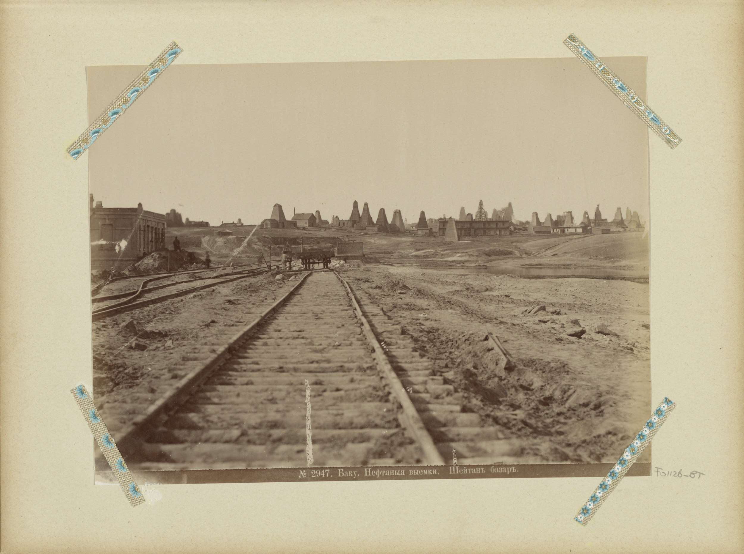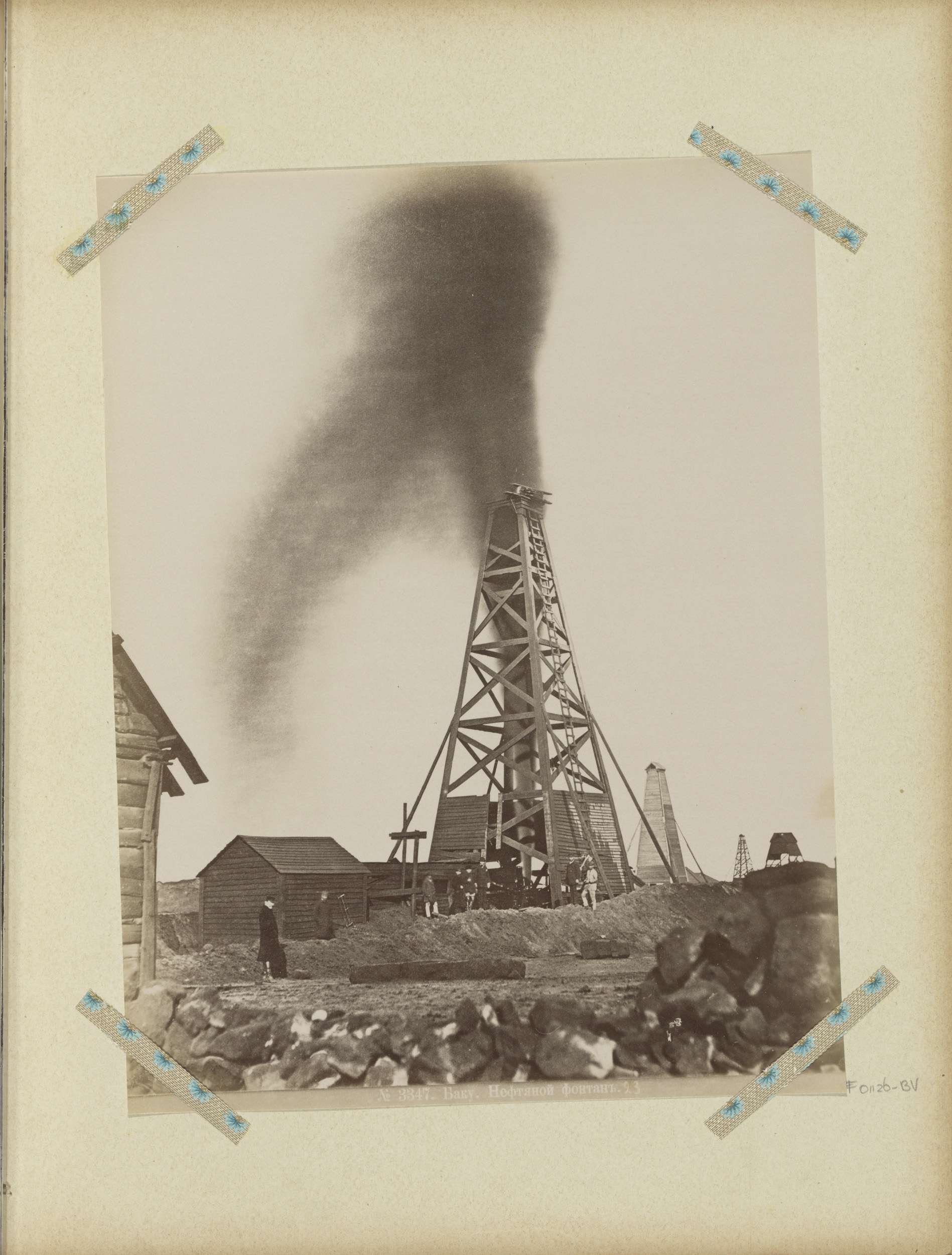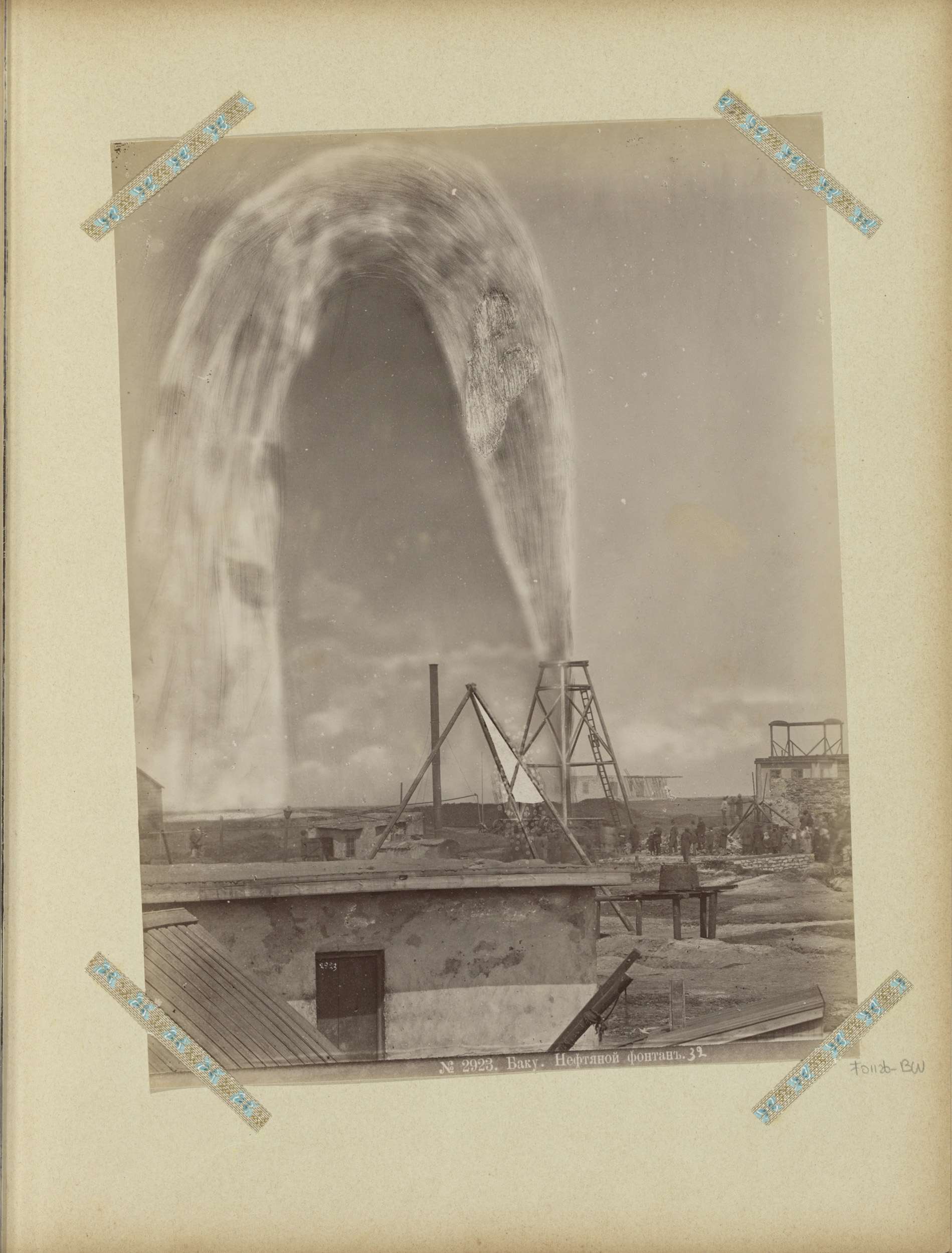 Brandende oliebron tussen twee boortorens in Bakoe