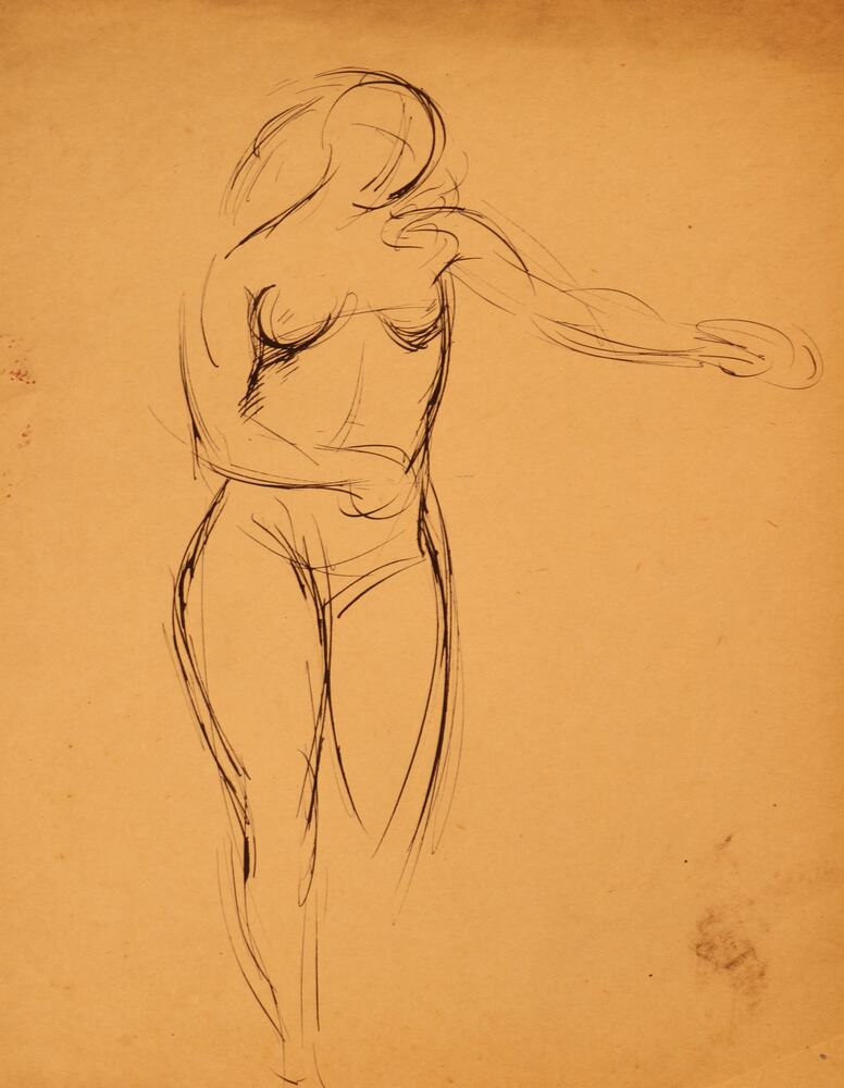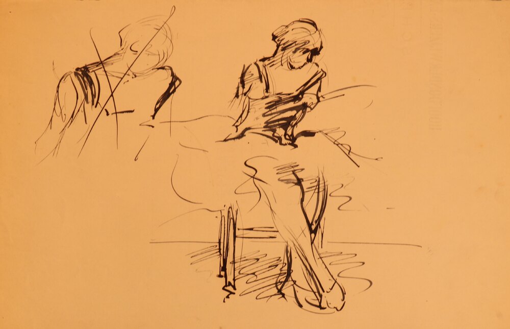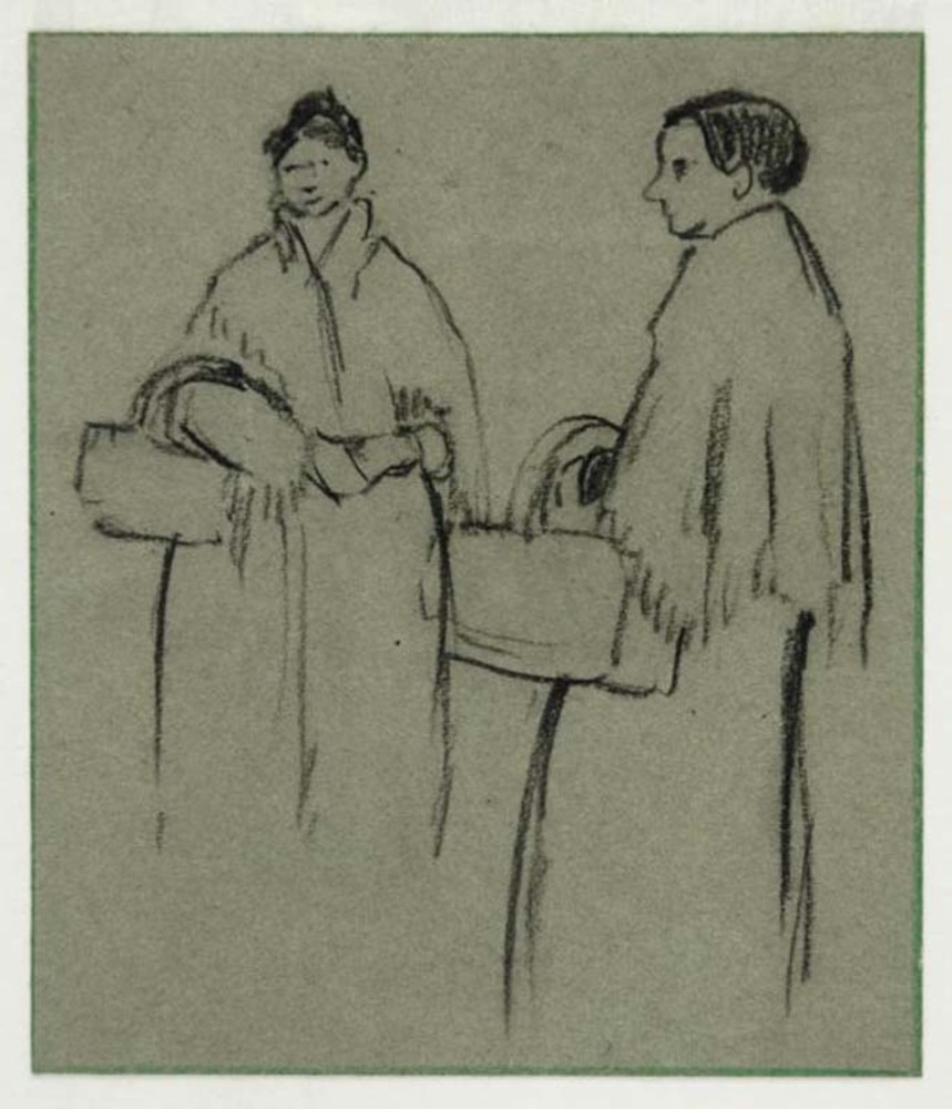 Figuurstudie van twee vrouwen met boodschappenmanden