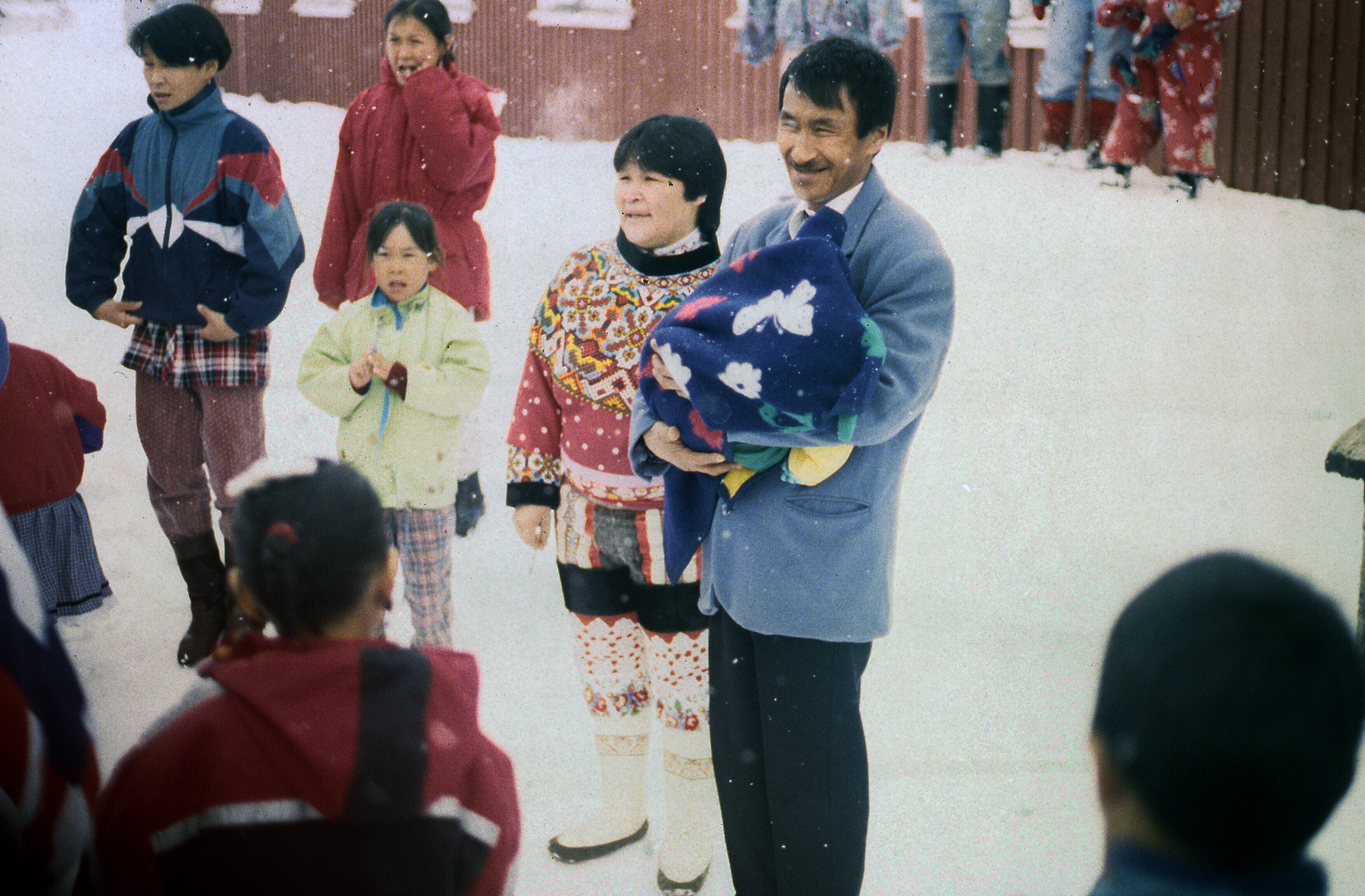 Mensen in Tiniteqilaaq wachten na de kerkdienst op h...