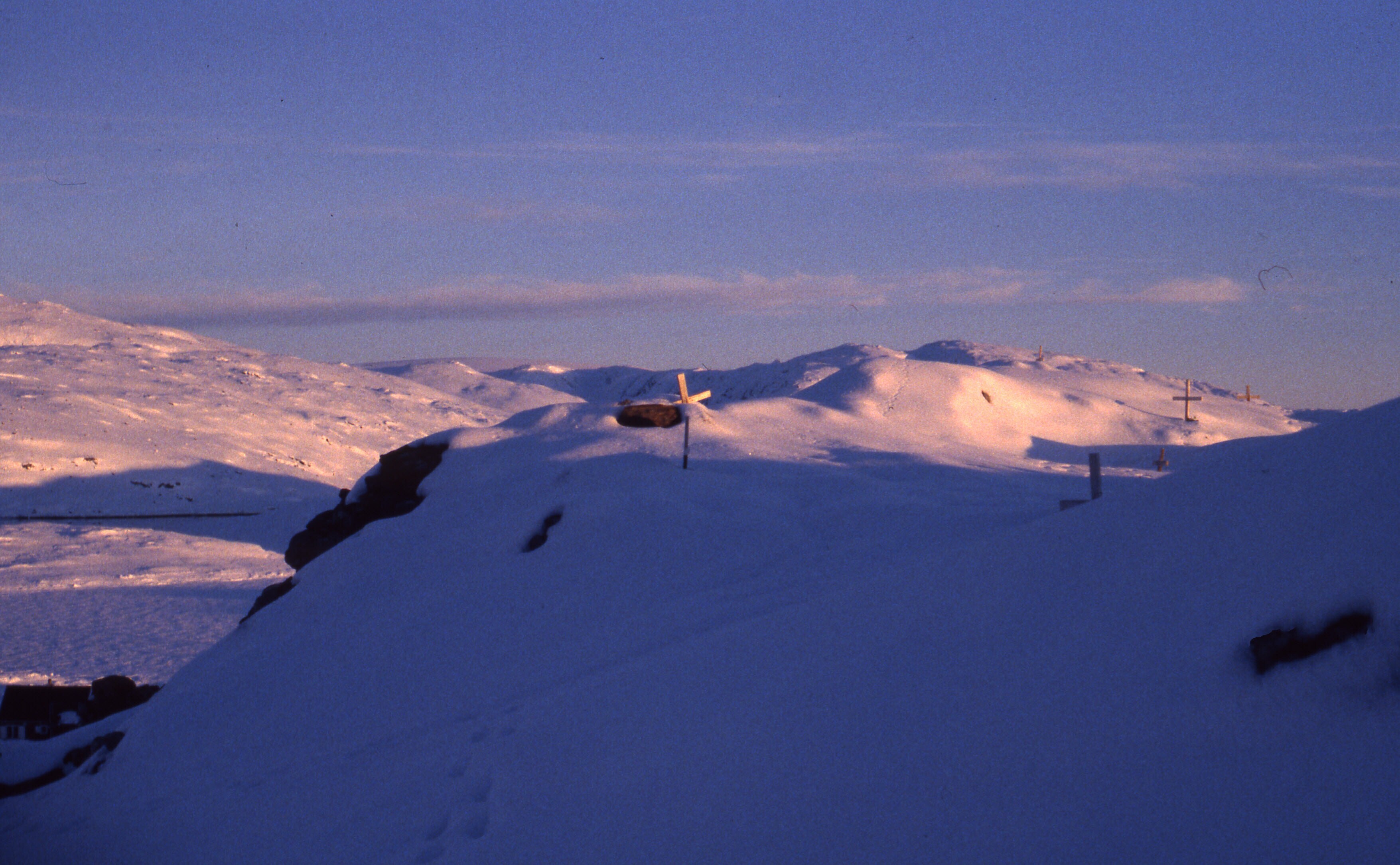 Landschap, besneeuwde berghelling met kruizen op enk...