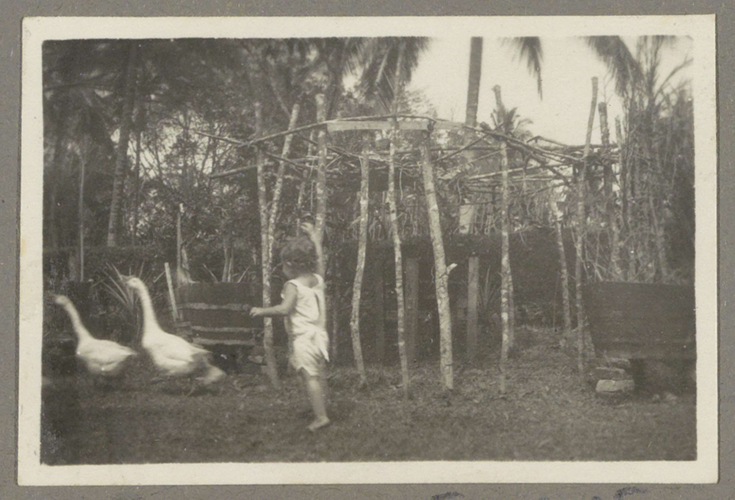 Kind met ganzen in een tuin op Sumatra